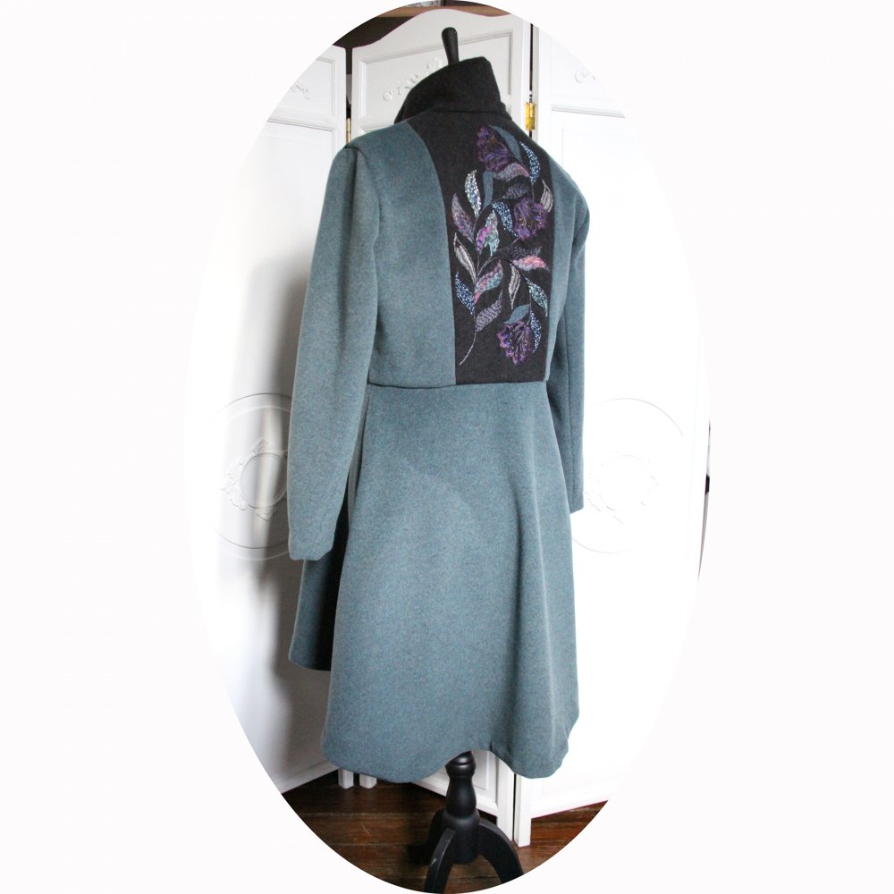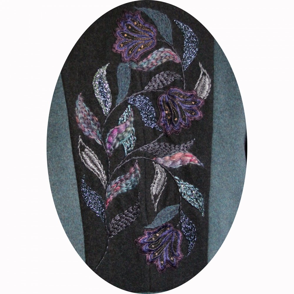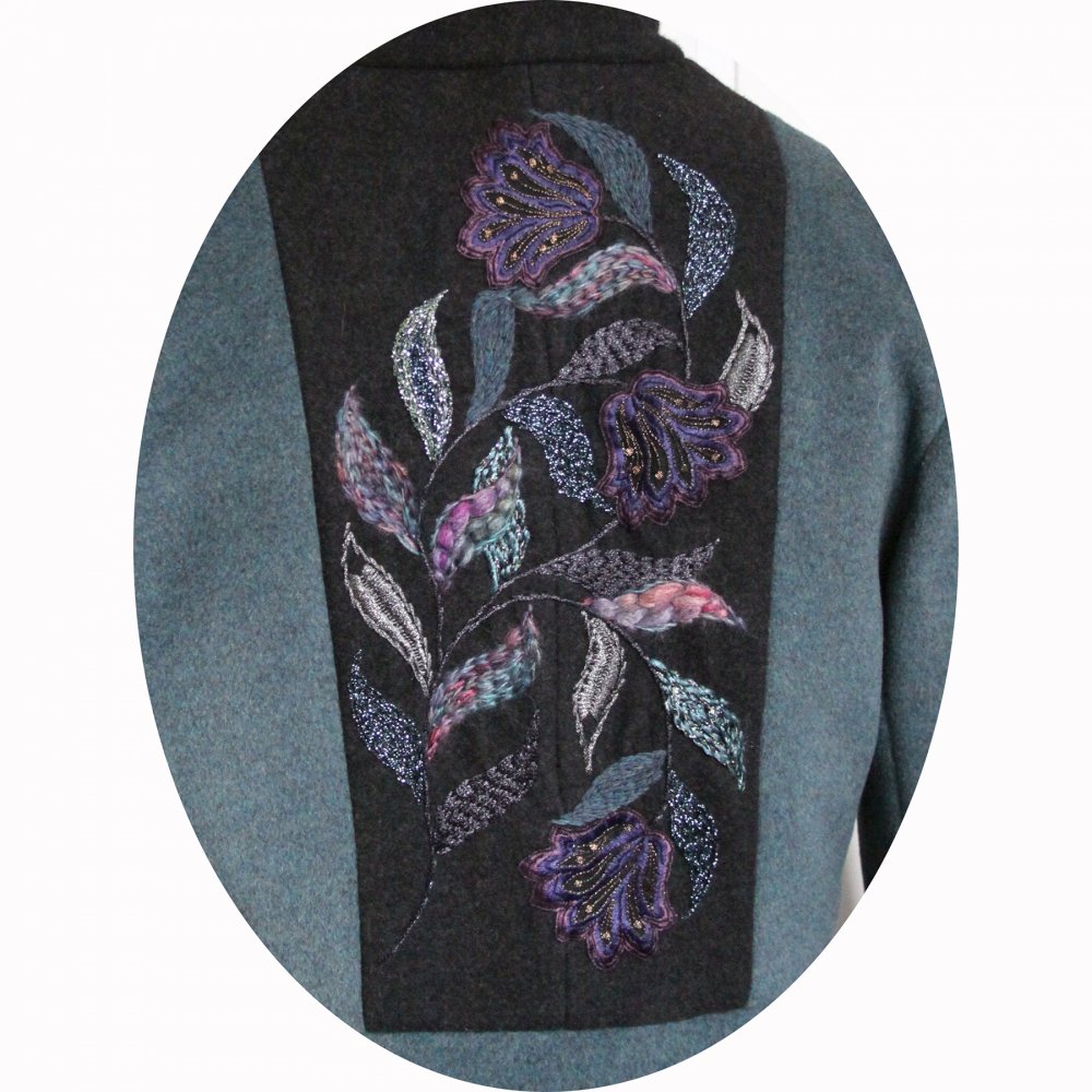 Ce manteau souple présente des broderies faites main sur le dos et les cotés devant. Ces broderies sont réalisées à la main à partir de fils fantaisie et de motifs en tulle brodé. Pour ce manteau j'ai réalisé la broderie sur un motif de feuilles fantaisie et de fleurs en violet / marine / bronze.