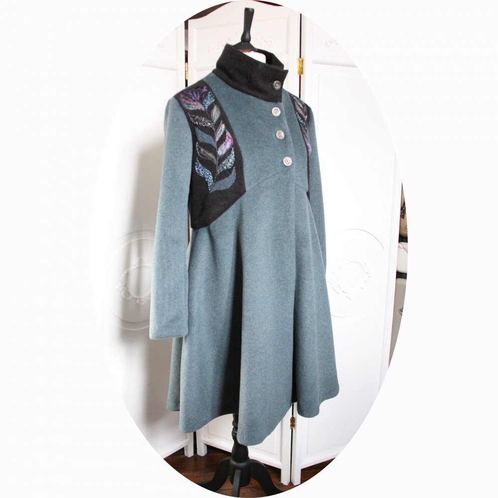 Manteau Spencer trapèze ample en laine bleue vert et laine gris anthracite.