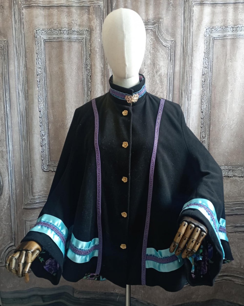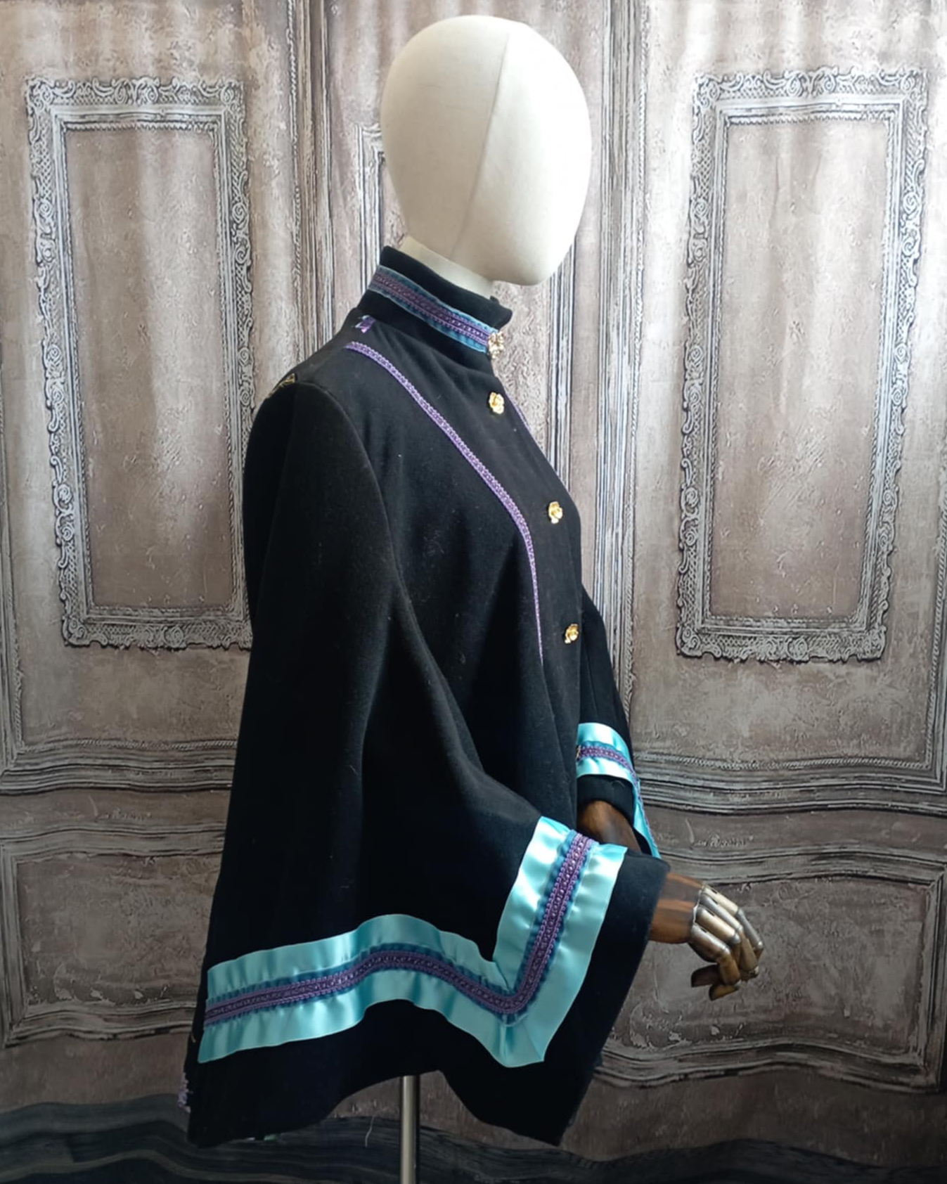 Manteau dolman en laine noire et galon de satin bleu.