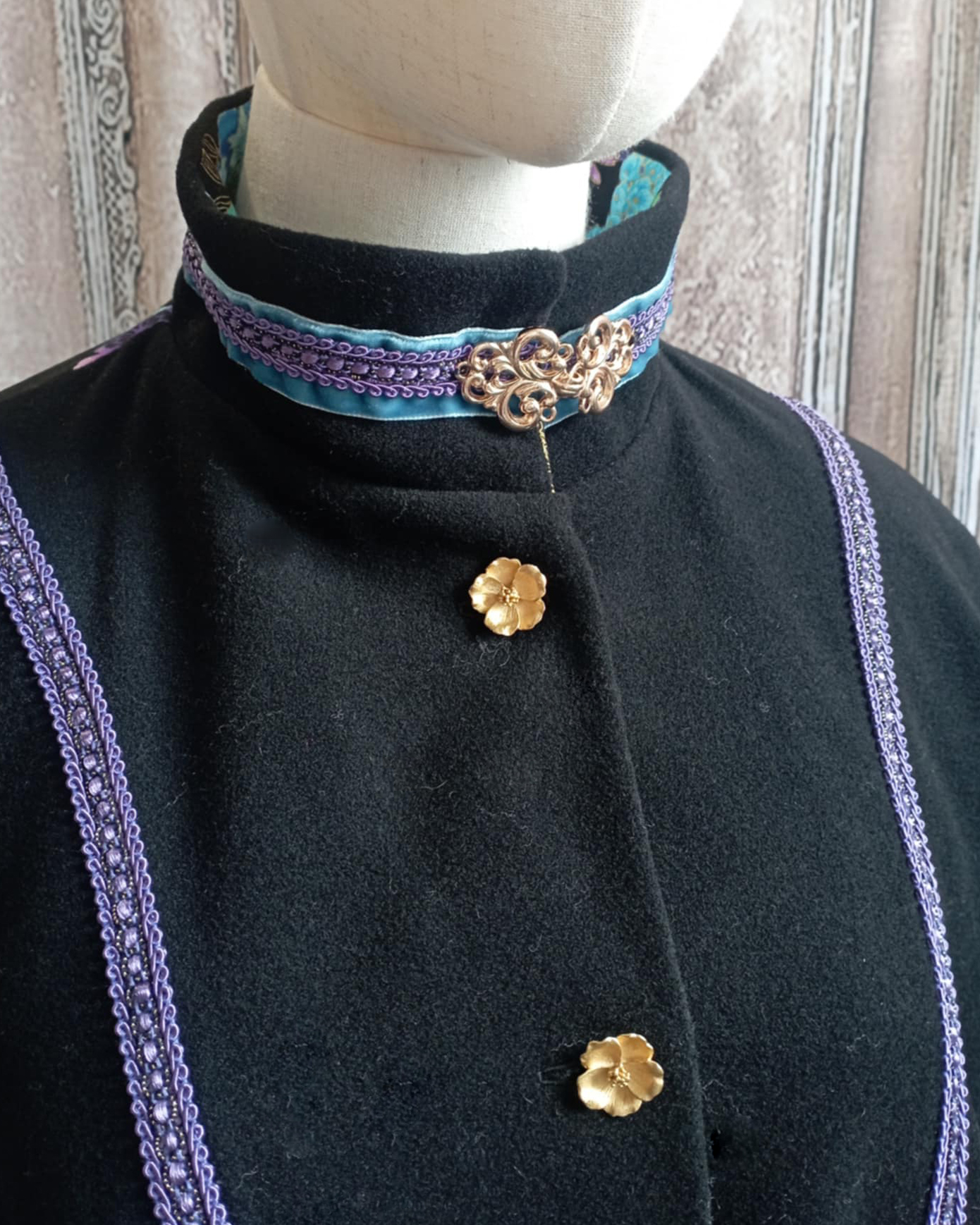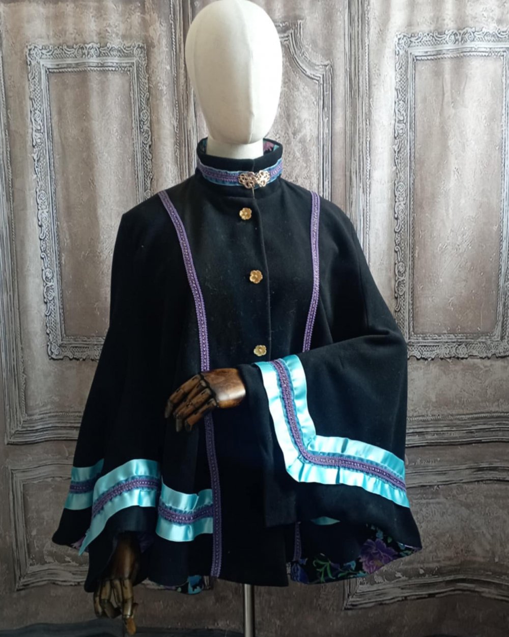 Manteau cape en laine noire et ruban bleu violet
