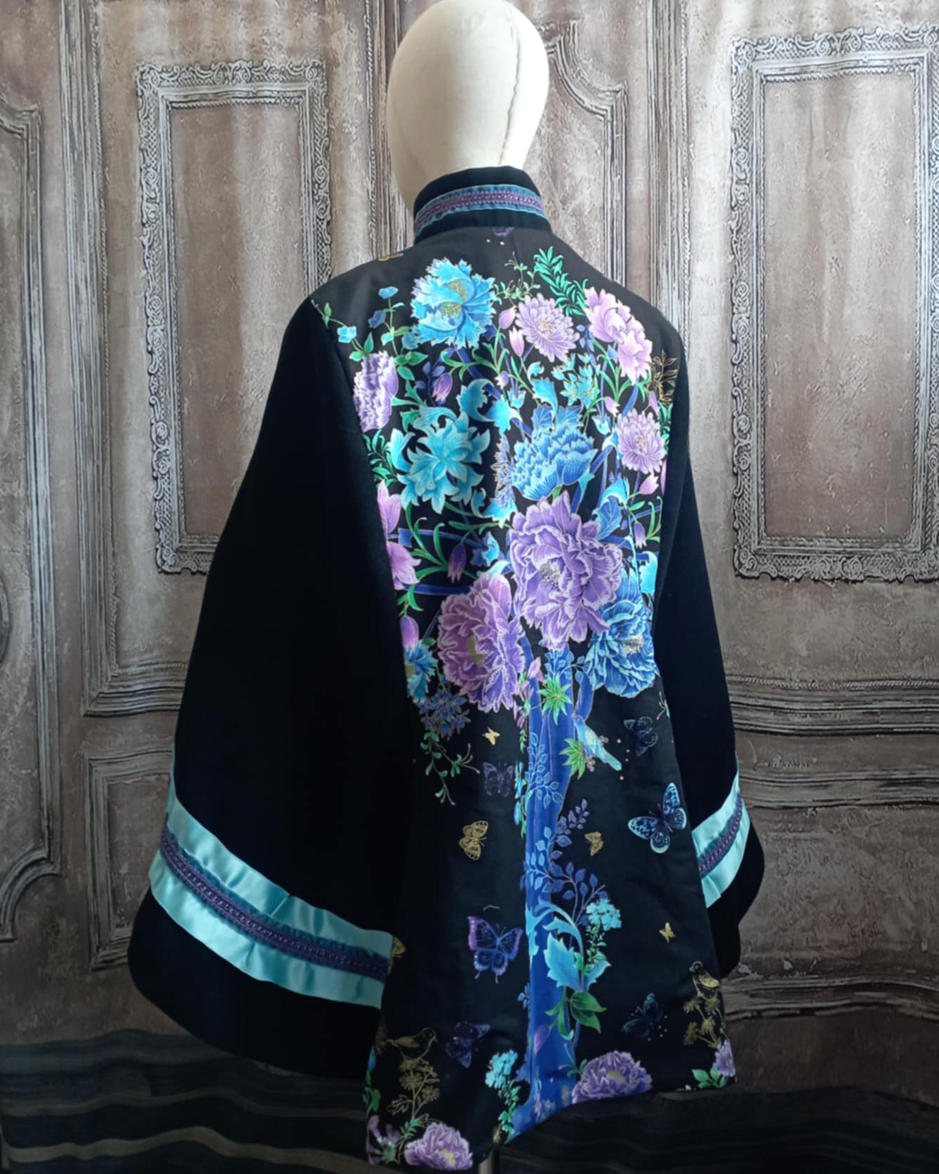 Une cape noire et bleue très unique, en drap de laine et cachemire noir et une belle doublure en coton imprimé, assortie au panneau utilisé dans le dos.