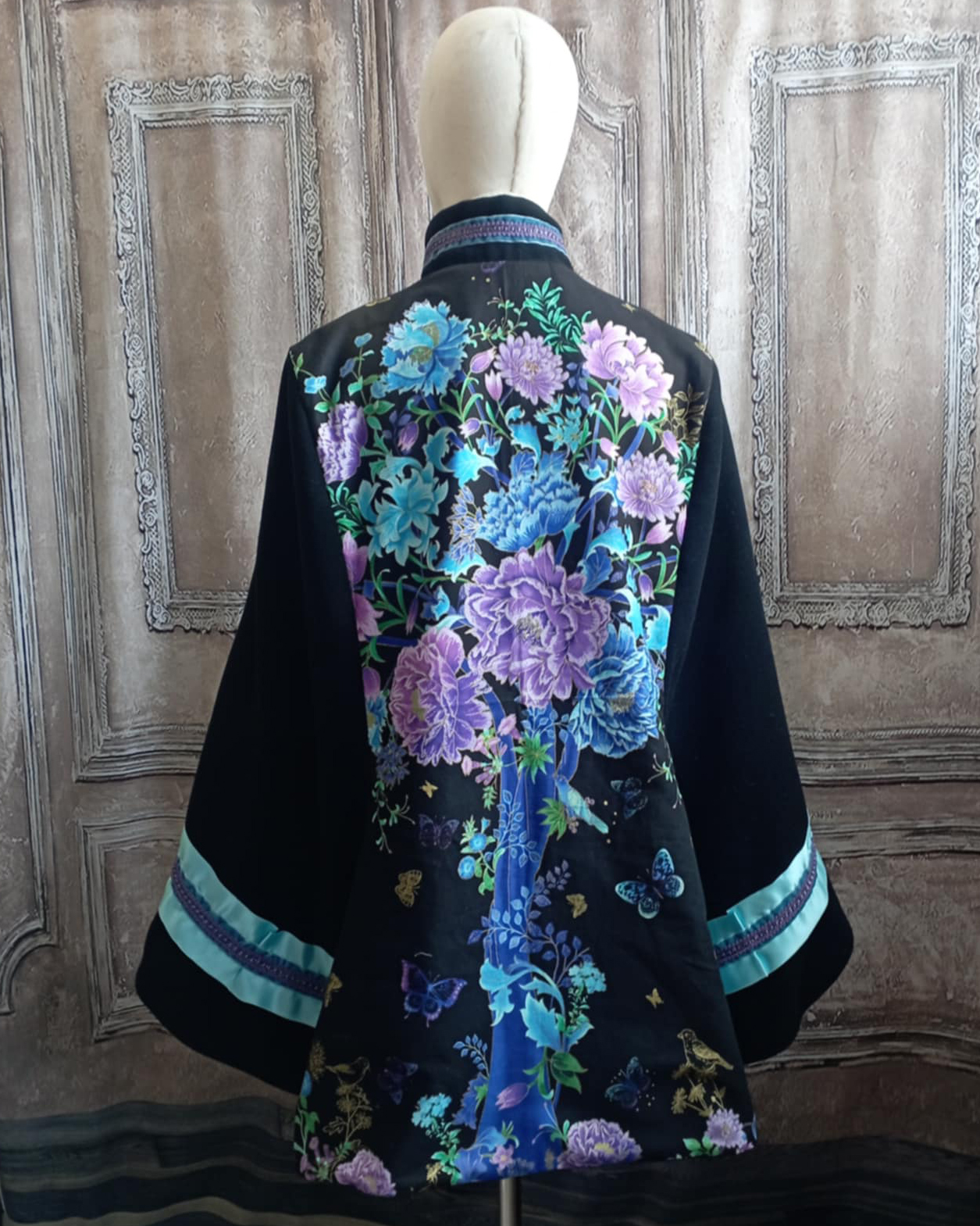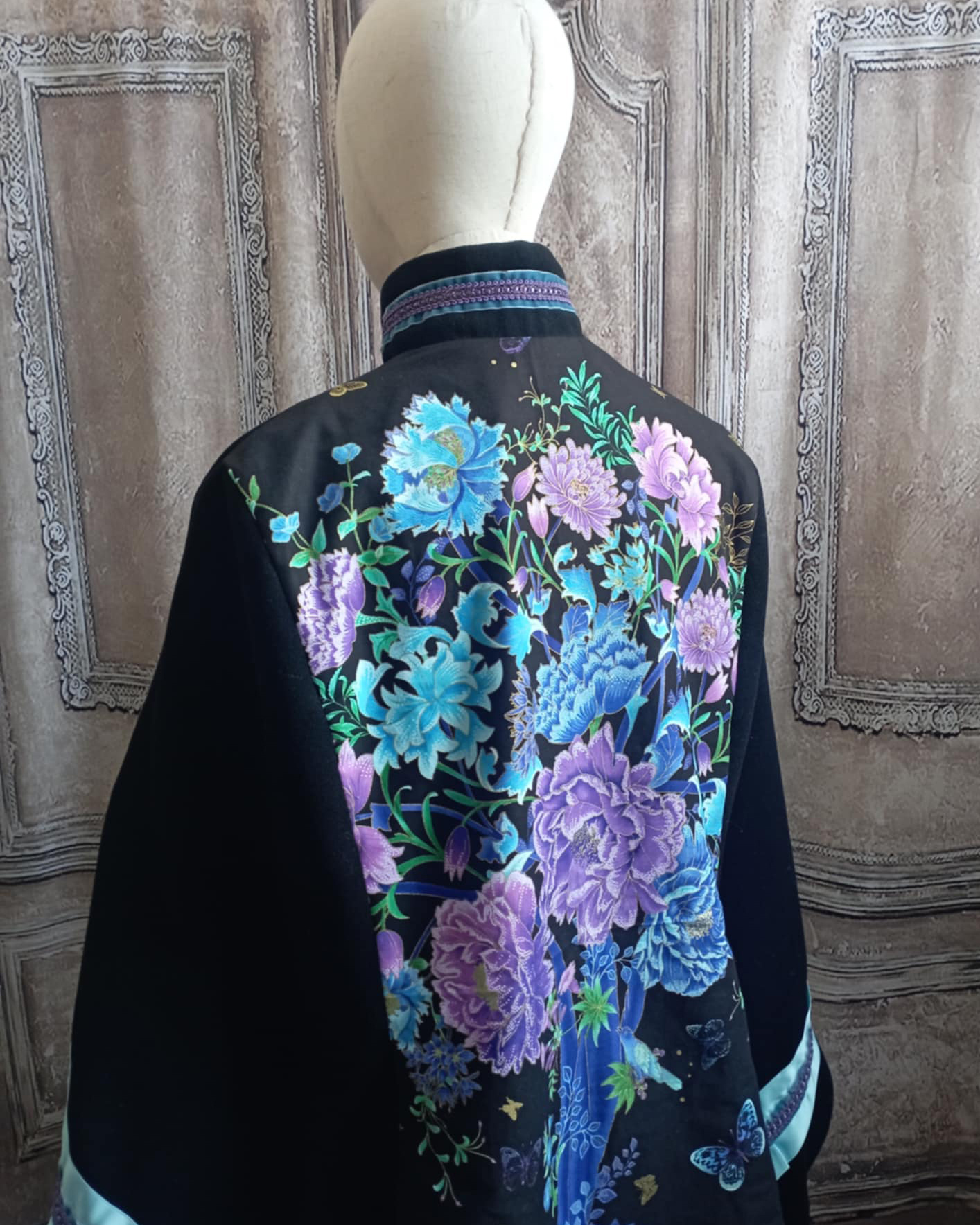 Pour le dos j'ai choisi un grand panneau de coton imprimé d'un arbre dans des tons bleu, violet et mauve, rehaussé de doré. Pour orner les manches et le devant j'ai utilisé un ruban de satin bleu azur et un galon de passementerie violet à touches de doré.