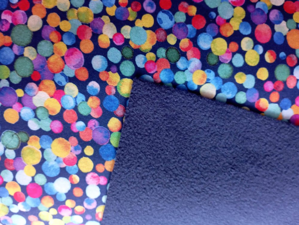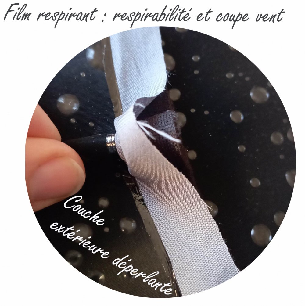 Pour le tissu j'ai craqué sur ce textile softshell noir à effet de gouttes d'eau que j'ai trouvé trop sympa et trop parfait pour une veste de pluie. J'ai en stock deux autres coloris de softshell : un bleu à pois multicolores et un rose fuchsia à fleurs colorées. Contactez moi pour une veste dans ces tissus.