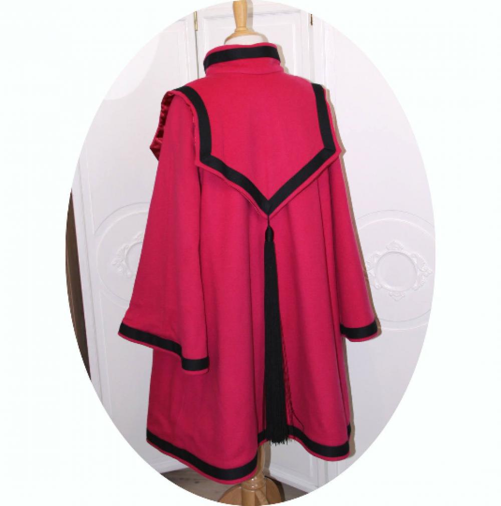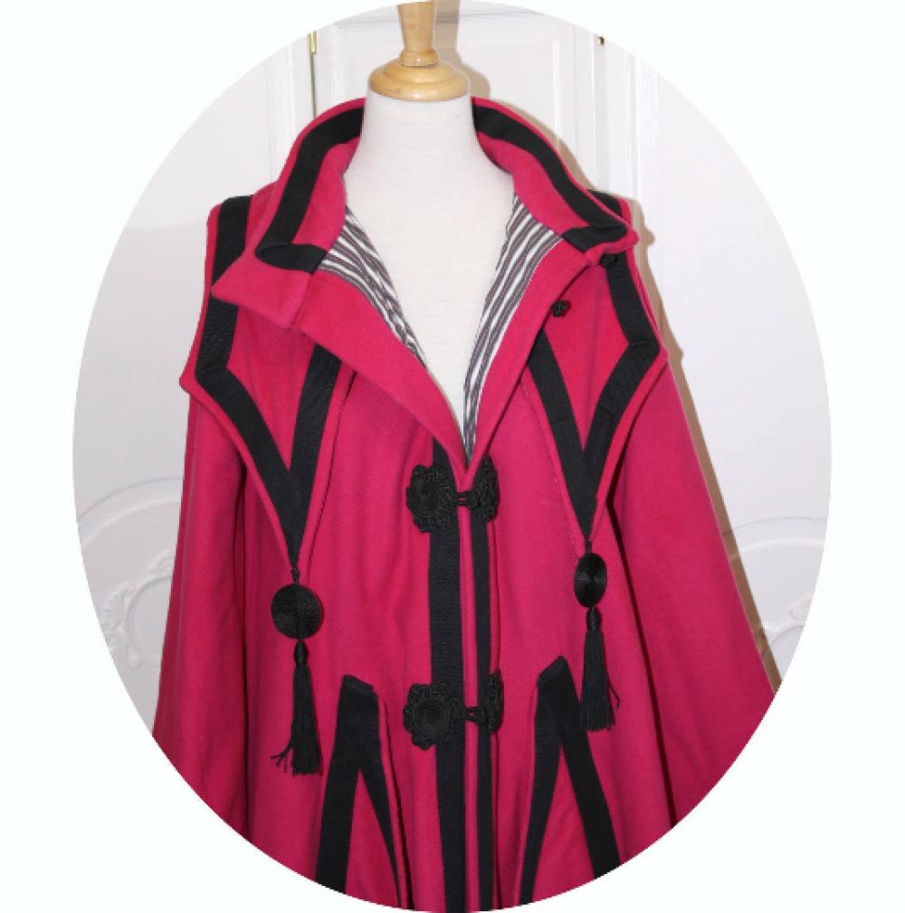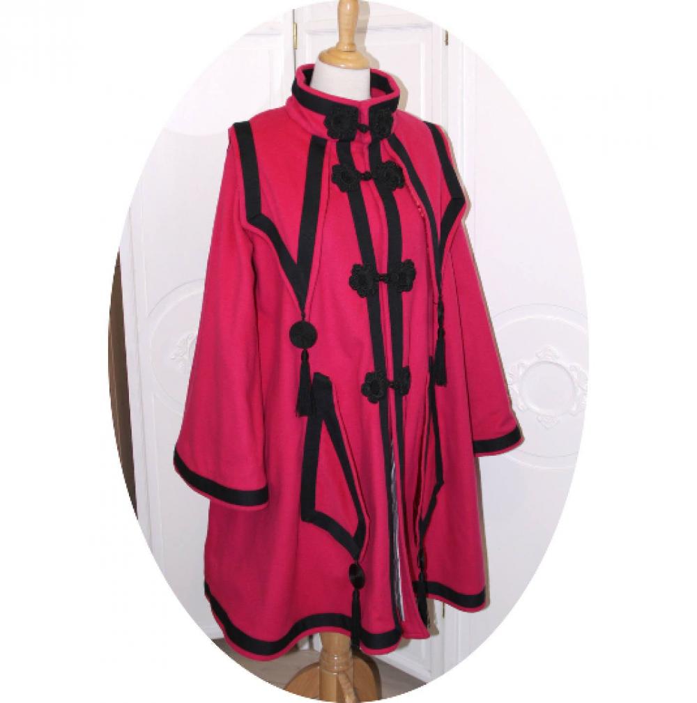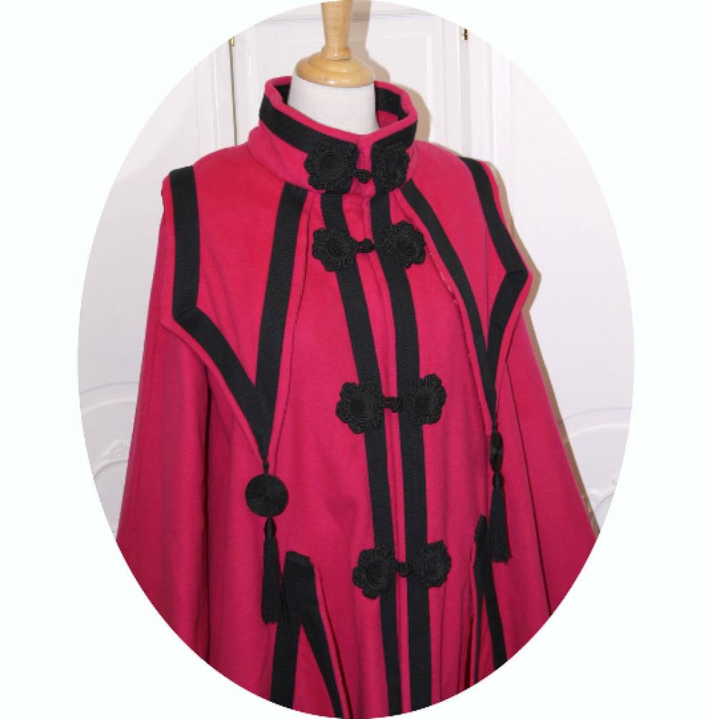 Manteau trapeze long en laine rose fuchsia brandebourgs et galon passementerie noirs