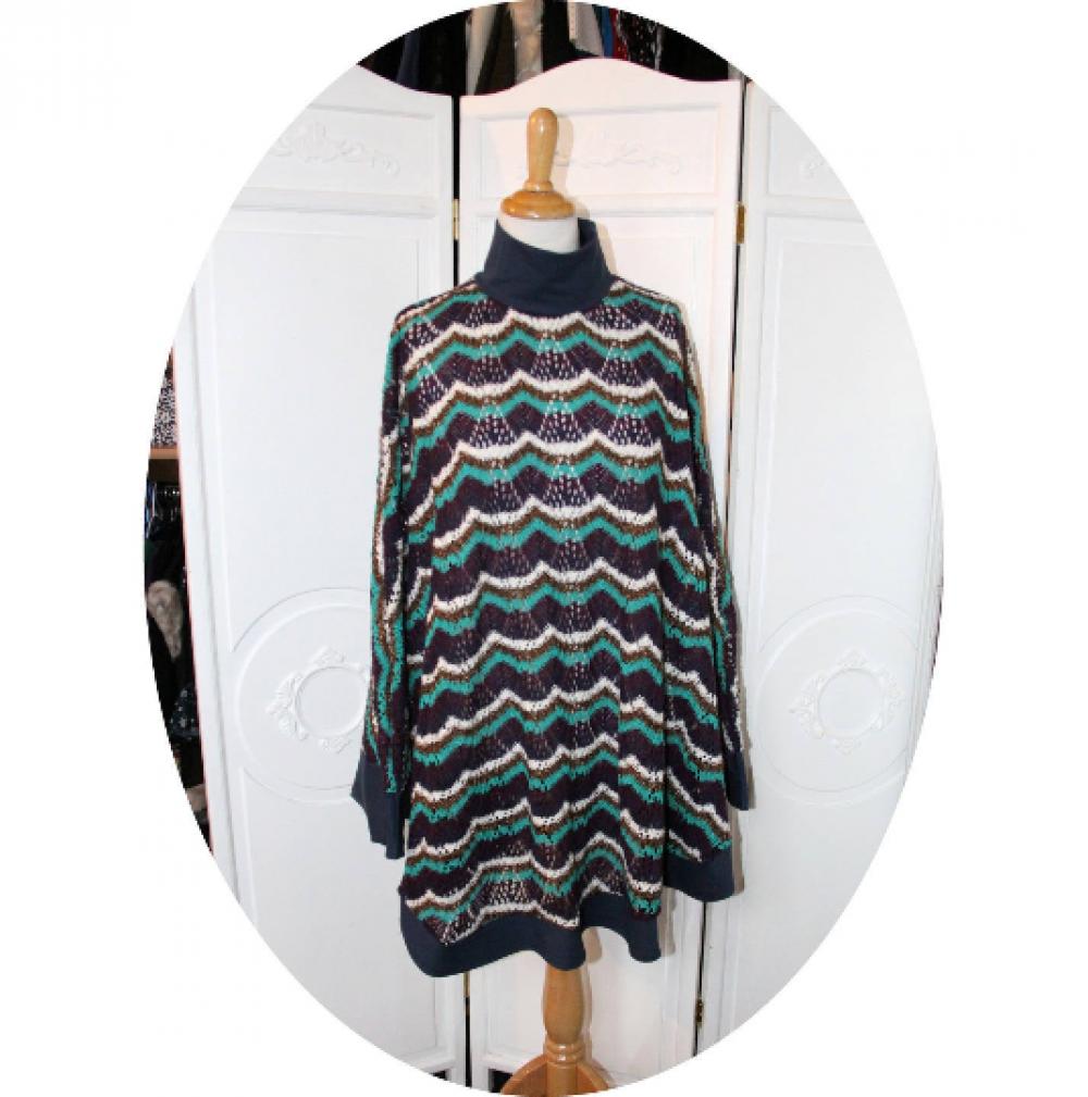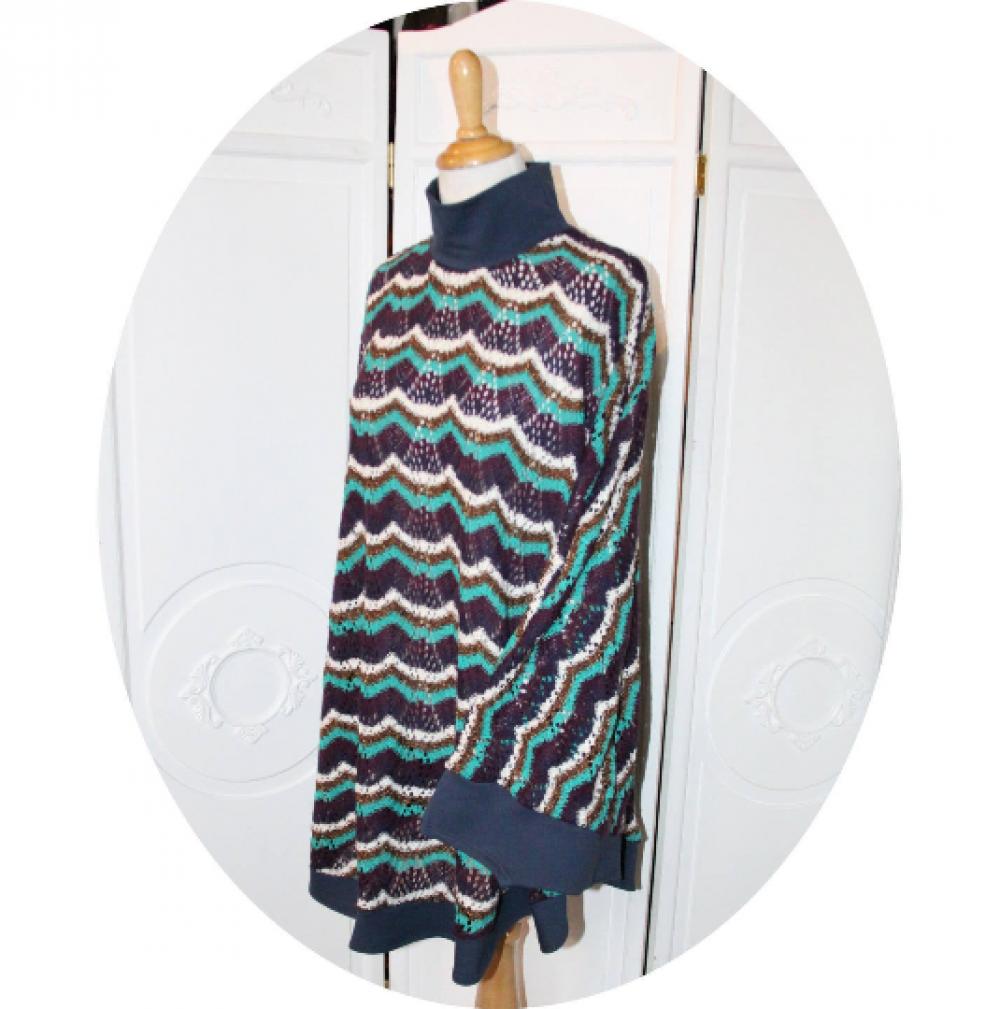 J'ai choisi une belle étoffe tricotée en maille ajourée, en alternance de couleurs marine, violet, vert, blanc, bronze, avec un effet de rayures. Pour le compléter et finir joliment les bords du poncho, j'ai choisi un jersey de coton bleu uni qui forme un petit col montant, ainsi qu'une bordure dans le bas, qui se termine en poignets sur les cotés.