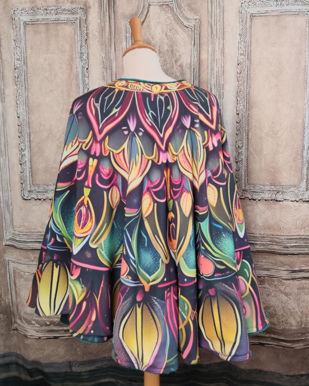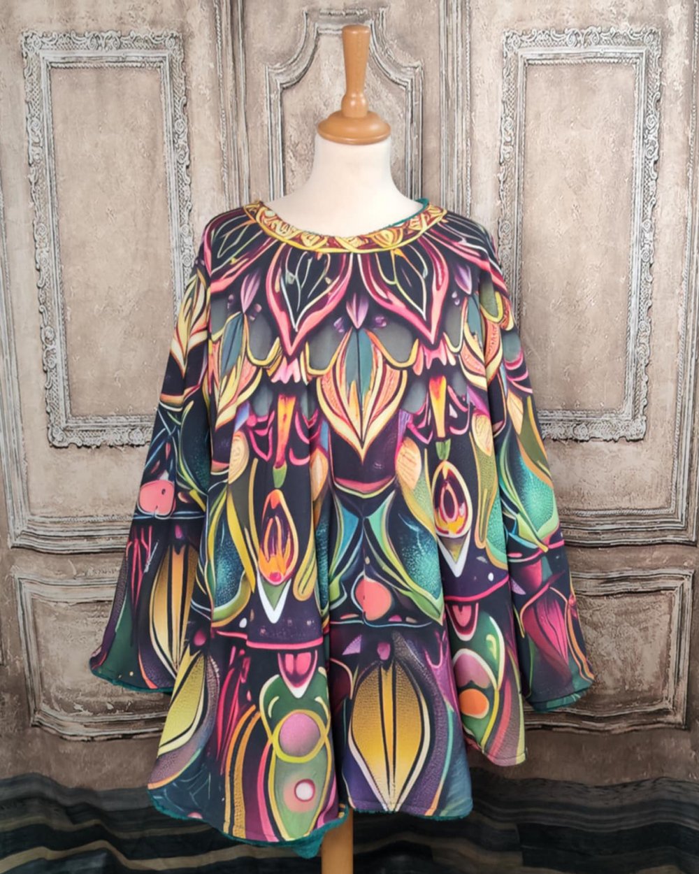 Un grand poncho fleur et vert et rose tout doublé de doudou polaire vert émeraude. Poncho en crêpe imprimé doublé de fourrure polaire avec une encolure arrondie. J'ai réalisé ce poncho à partir d'un crêpe polyester imprimé d'un motif de fleur, avec une encolure arrondie qui suit le coeur de la fleur, et il est TOUT doublé de MOUMOUTE polaire. Bref, un rêve de frileuse invétérée. Pour l'imprimé, j'ai craqué sur ce crepe imprimé en cercle comme une vraie fleur, dans des belles couleurs vives, tout en finesse. Pour la doublure, un doudou polaire vert émeraude, assorti aux tons de l'imprimé. Pièce unique, convient jusqu'au 48/50. N'hésitez pas à me contacter pour une réalisation sur mesure.