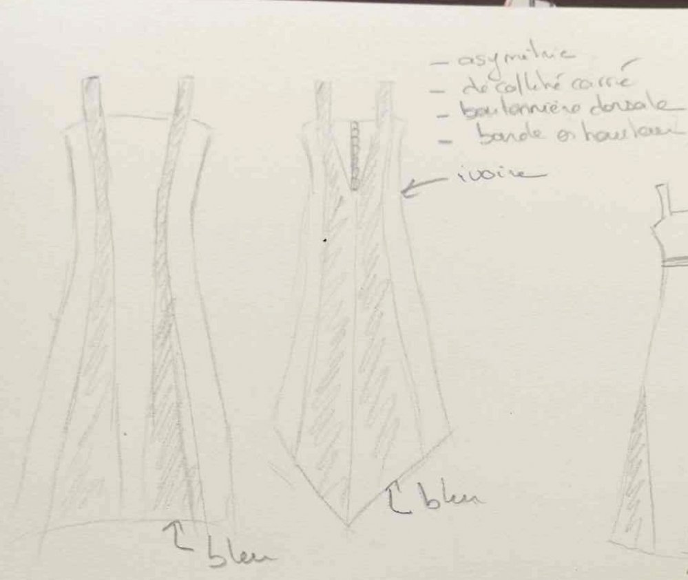 Réservé pour Maud Acompte pour la réalisation de votre robe de mariée sur mesure, d'après nos échanges, sur la base d'une silhouette Années en crêpe de soie ivoire et bleue, détails en tulle brodé bleu.