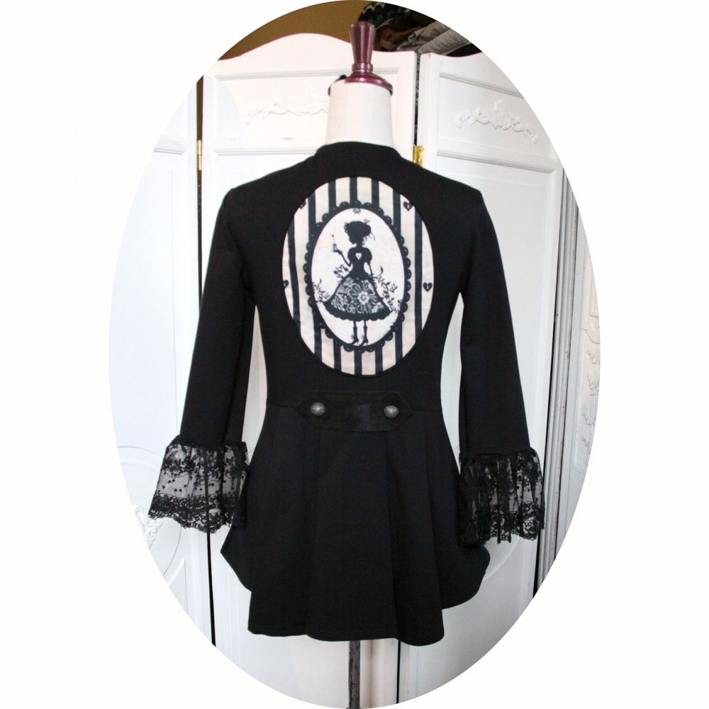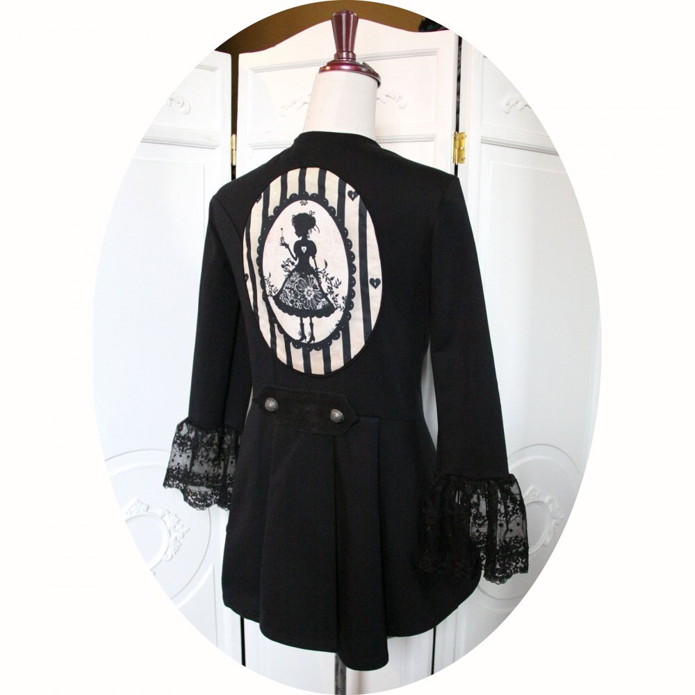 Veste queue de pie Steampunk à manches trois quart en coton noir et médaillon camée dans le dos.