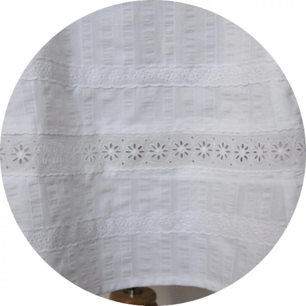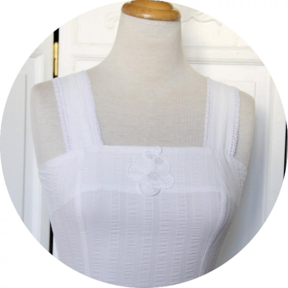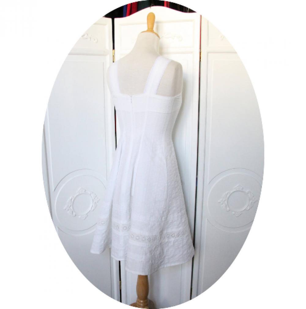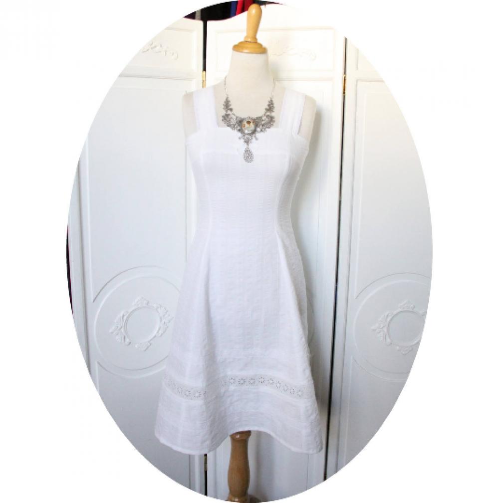 Robe blanche courte et évasée à bretelles en coton à rayures et broderie anglaise facon lingerie ancienne
