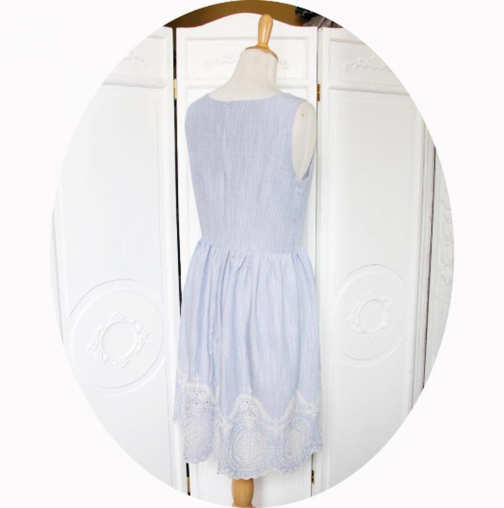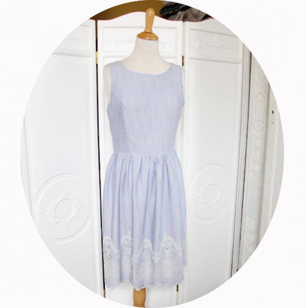 Robe d'été courte et sans manches à jupe froncée en tissu fluide bleu ciel et broderie blanche