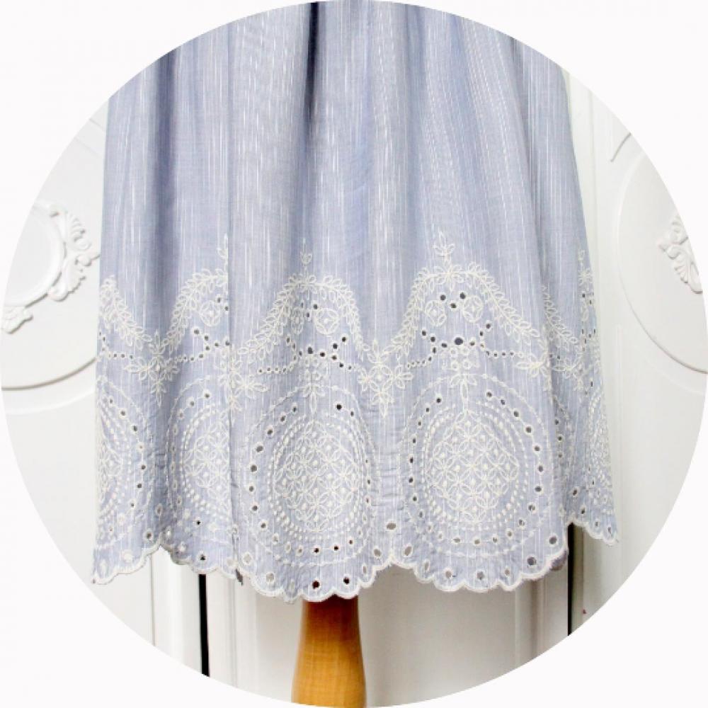Pour cette robe rétro chic j'ai choisi un joli tissu viscose en bleu chiné, brodé dans le bas dans un style de dentelle ancienne.