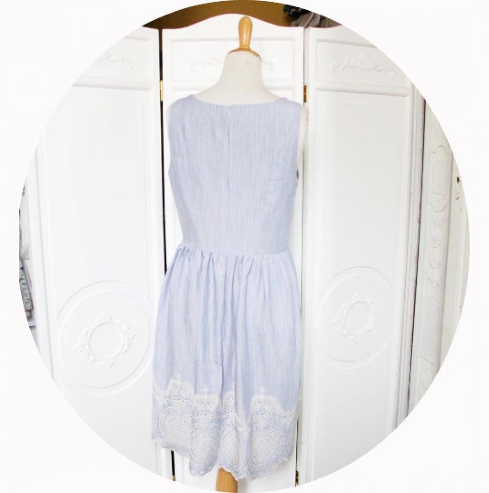 Robe brodée bleu et blanche, sans manches a jupe froncée a la taille.