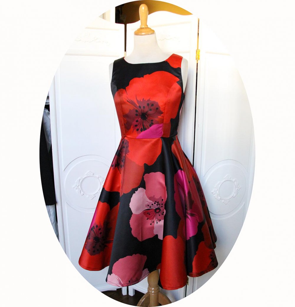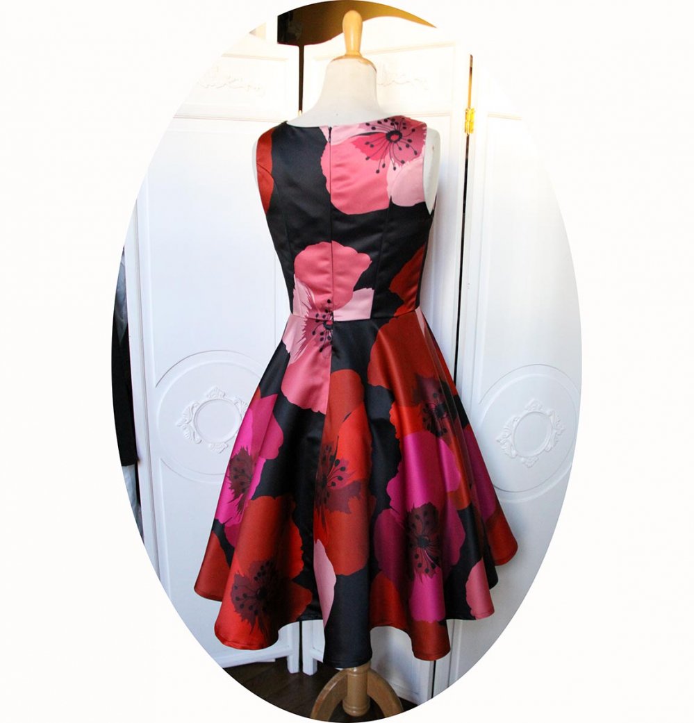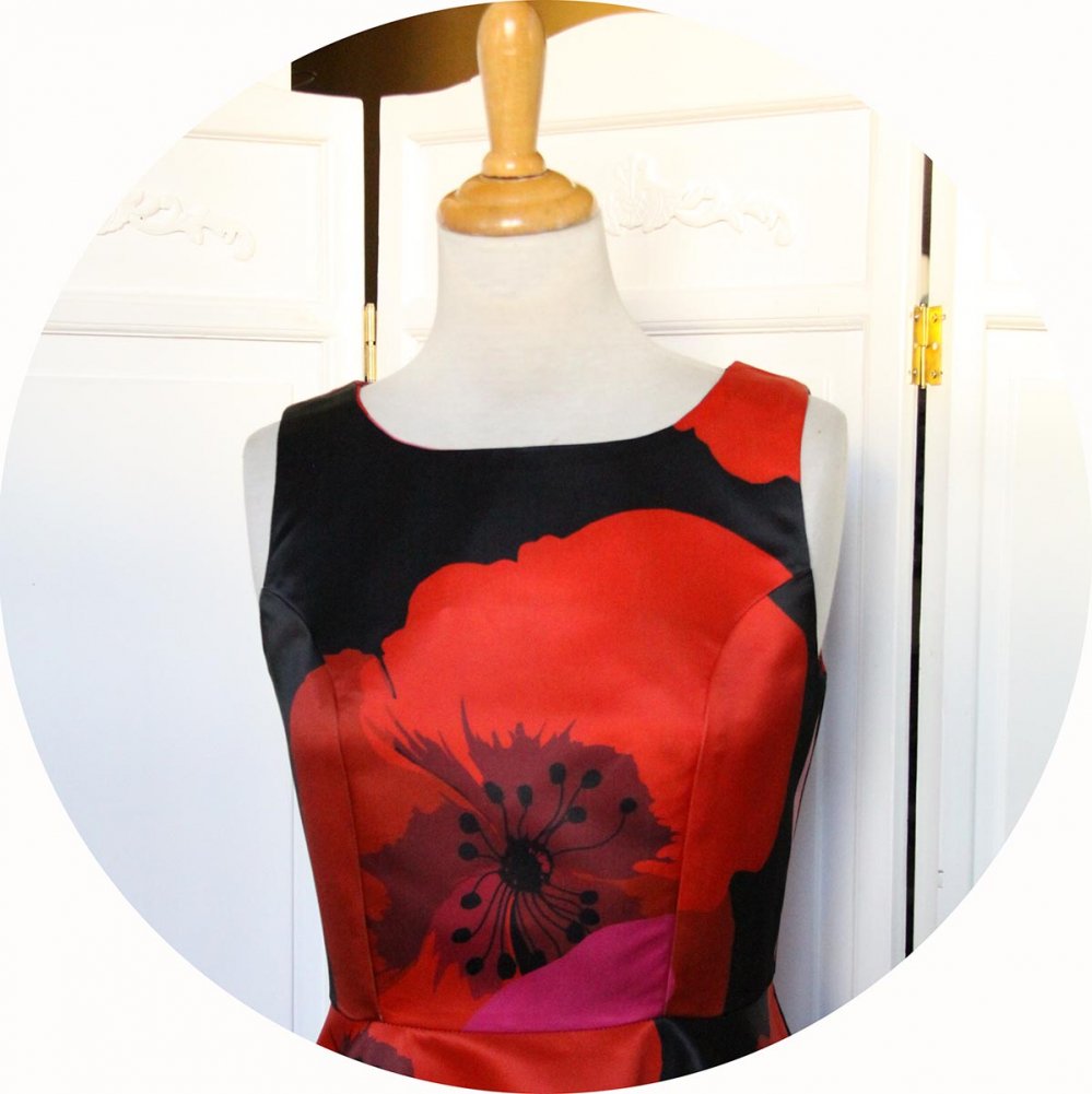 Robe dans l'esprit des années 50 en satin noir imprimé de coquelicots rouges et roses.