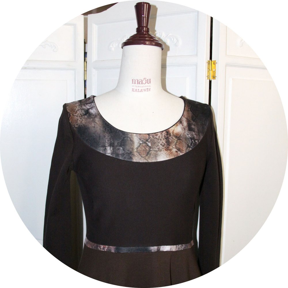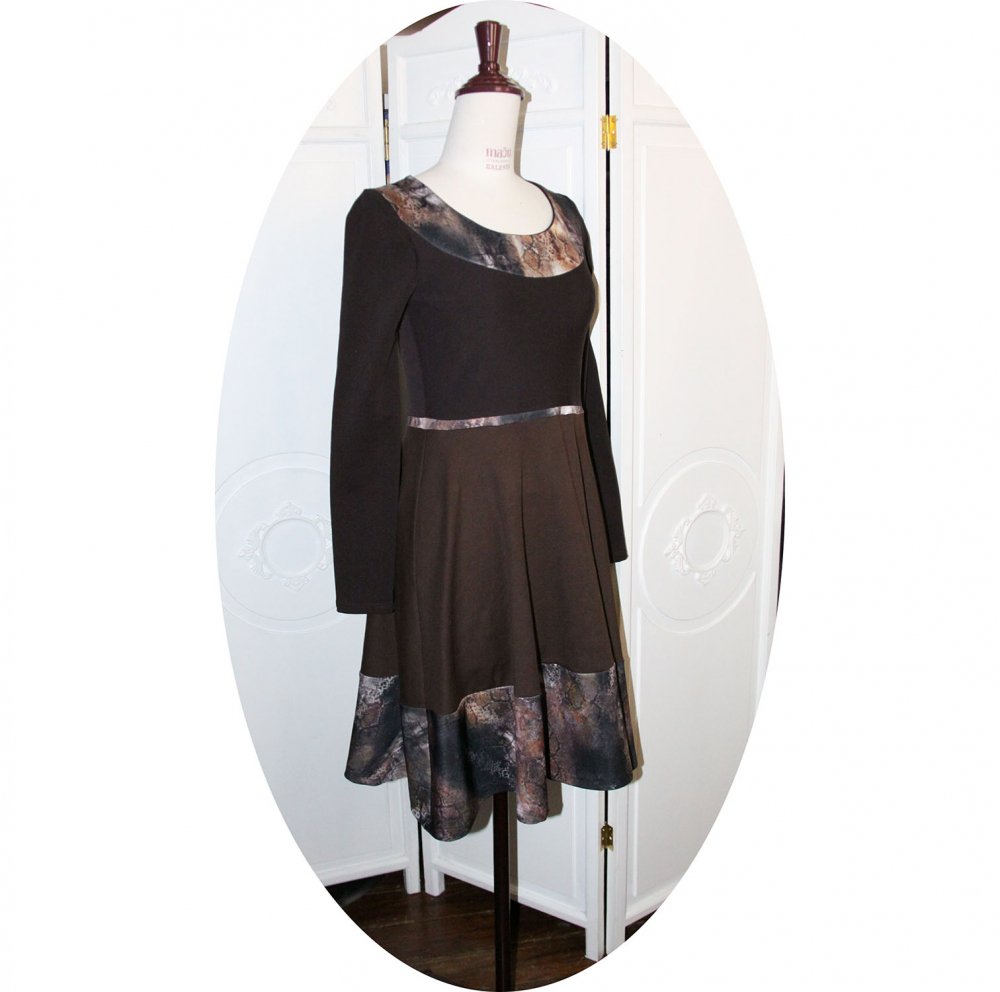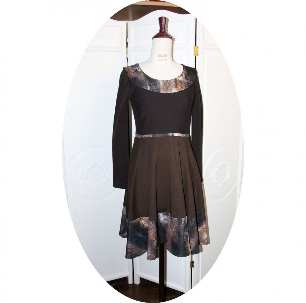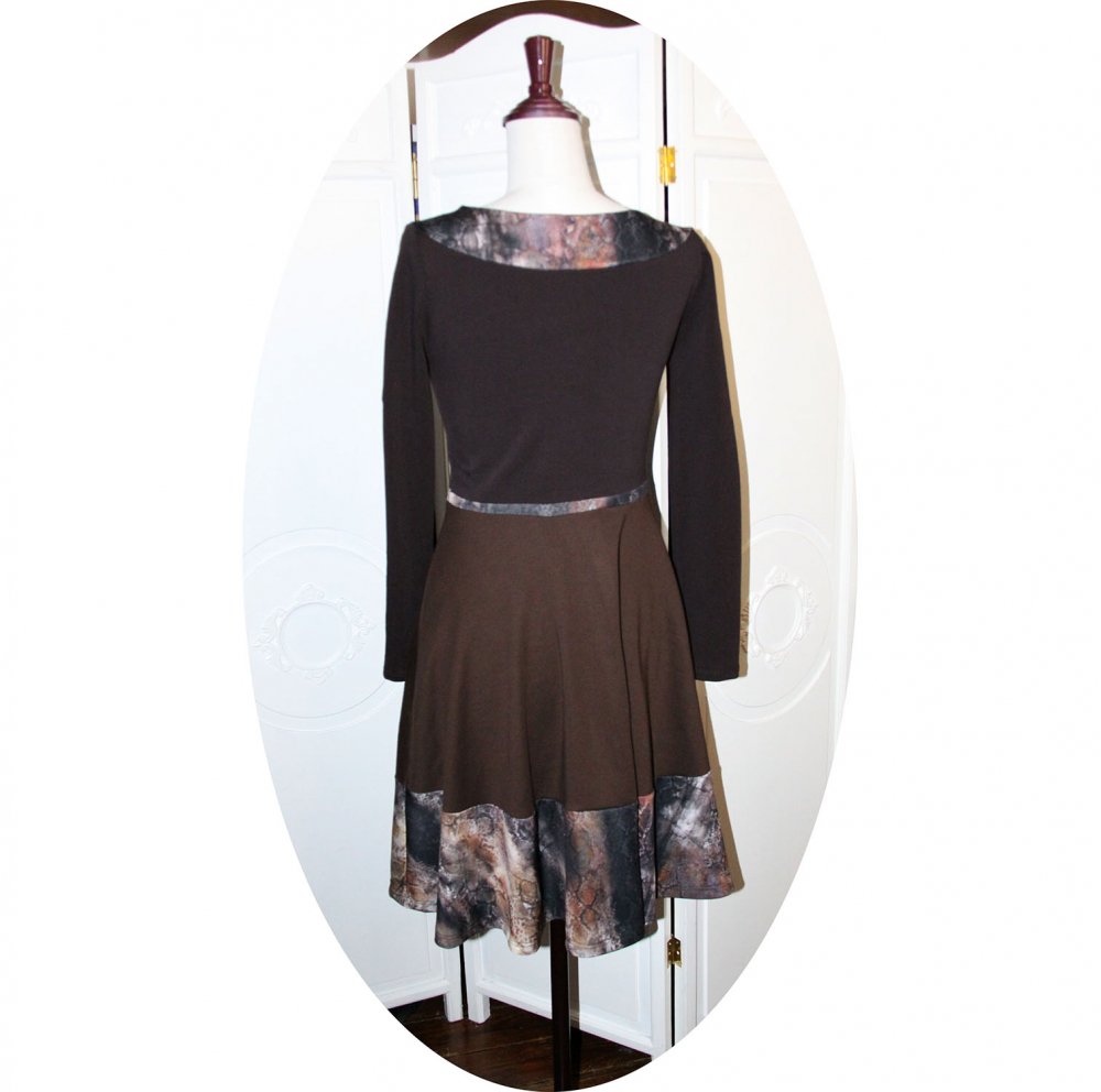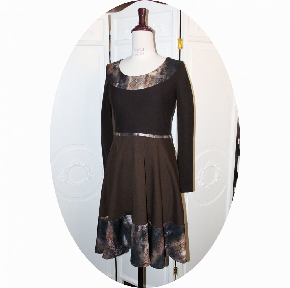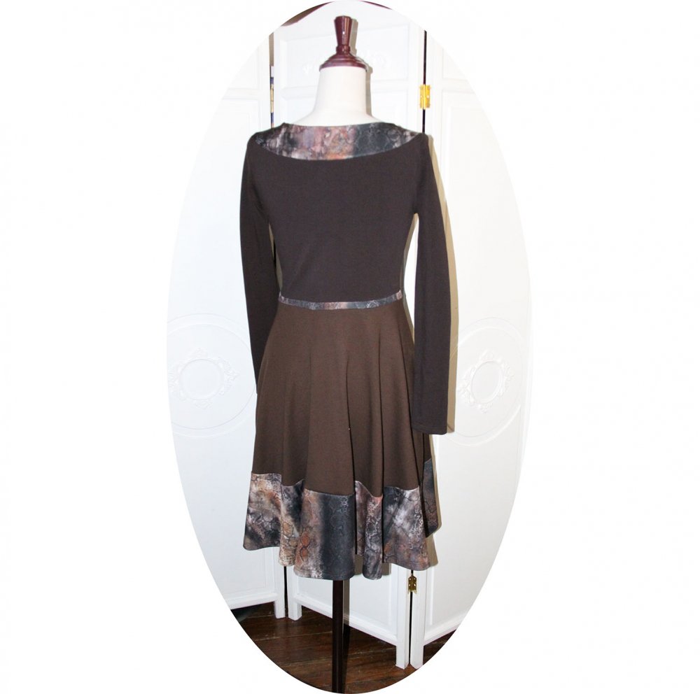 Un nouveau modèle de robe évasée à manches longues en maille jersey coton marron uni et bandes de maile imprimée dans des tons marron, beige et rouille.