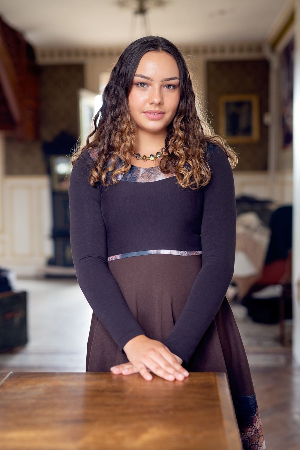 Tailles 38 en stock, présentée sur un buste en 38 et portée par Romane qui fait un 40/42.
