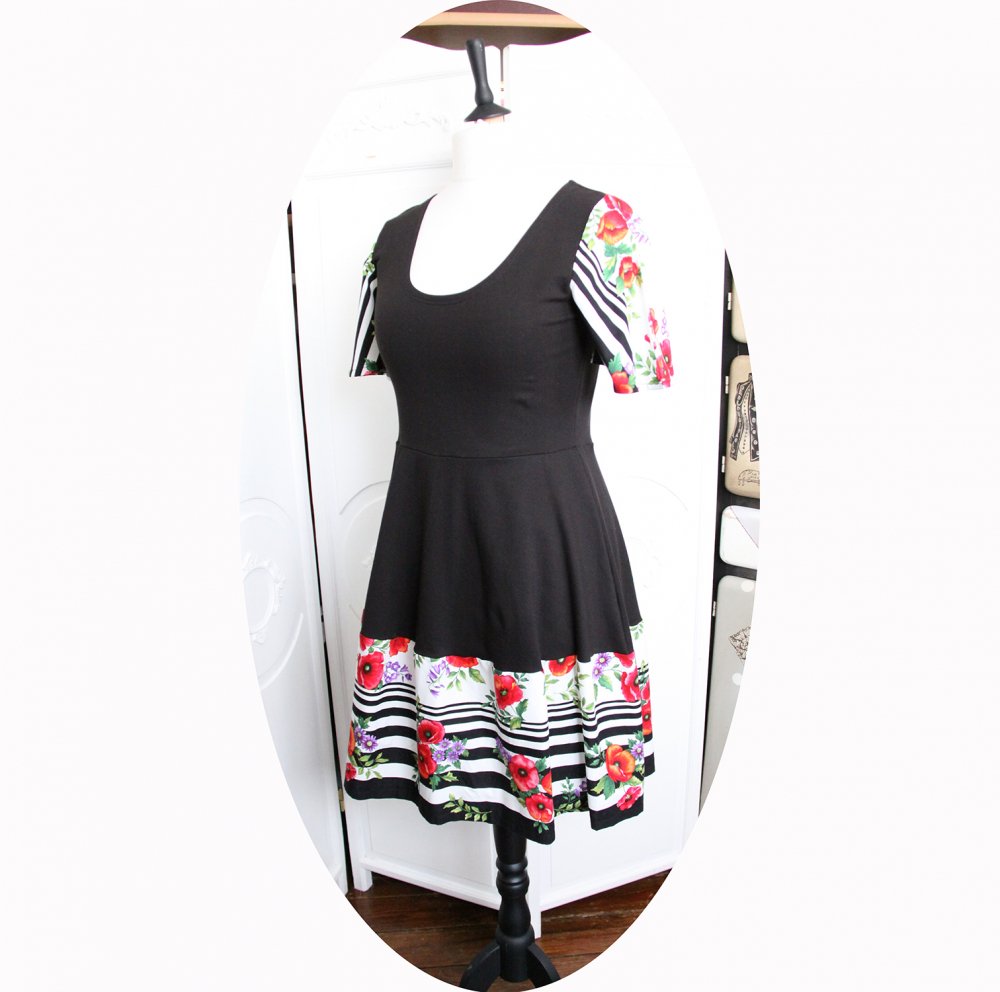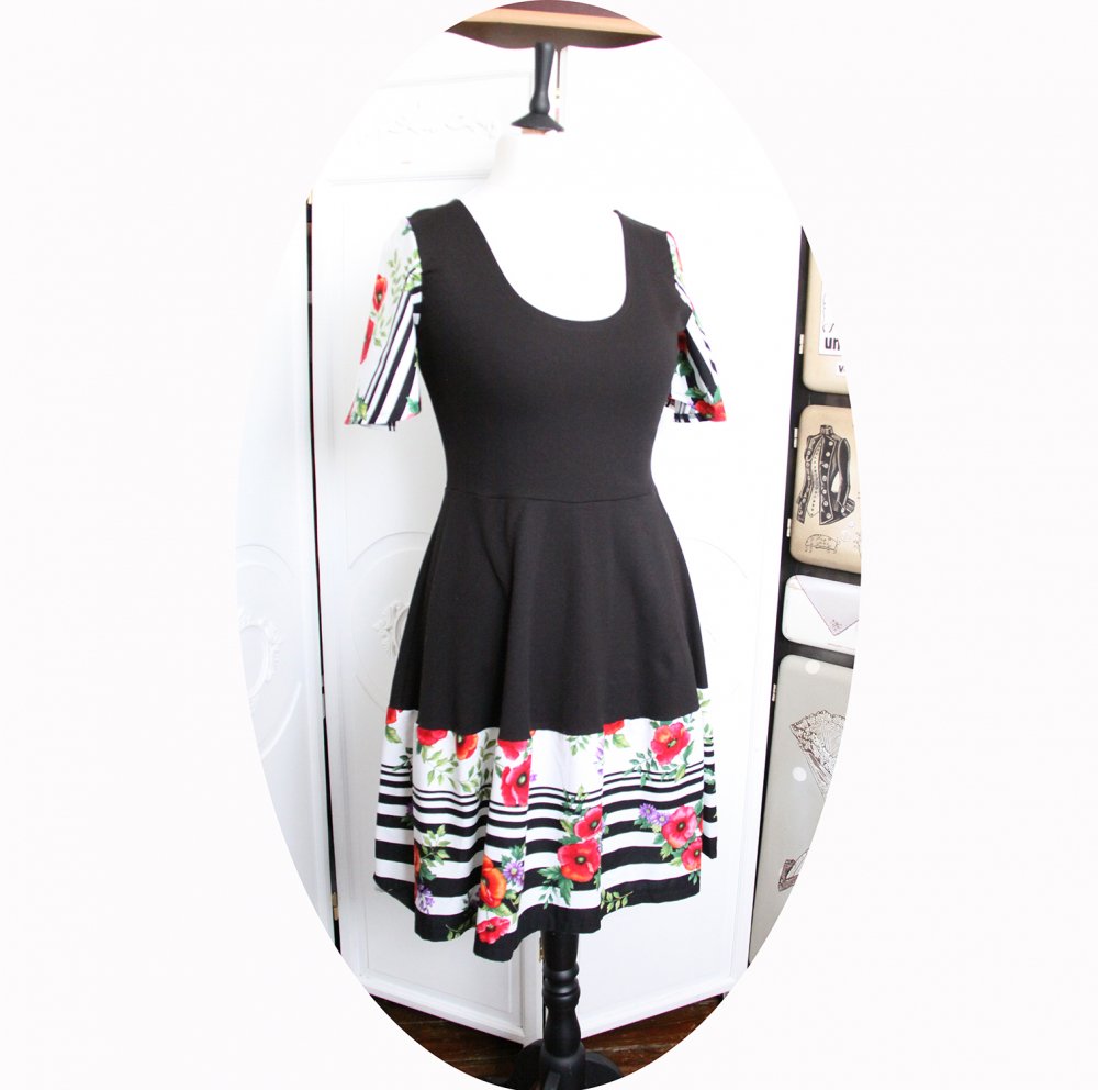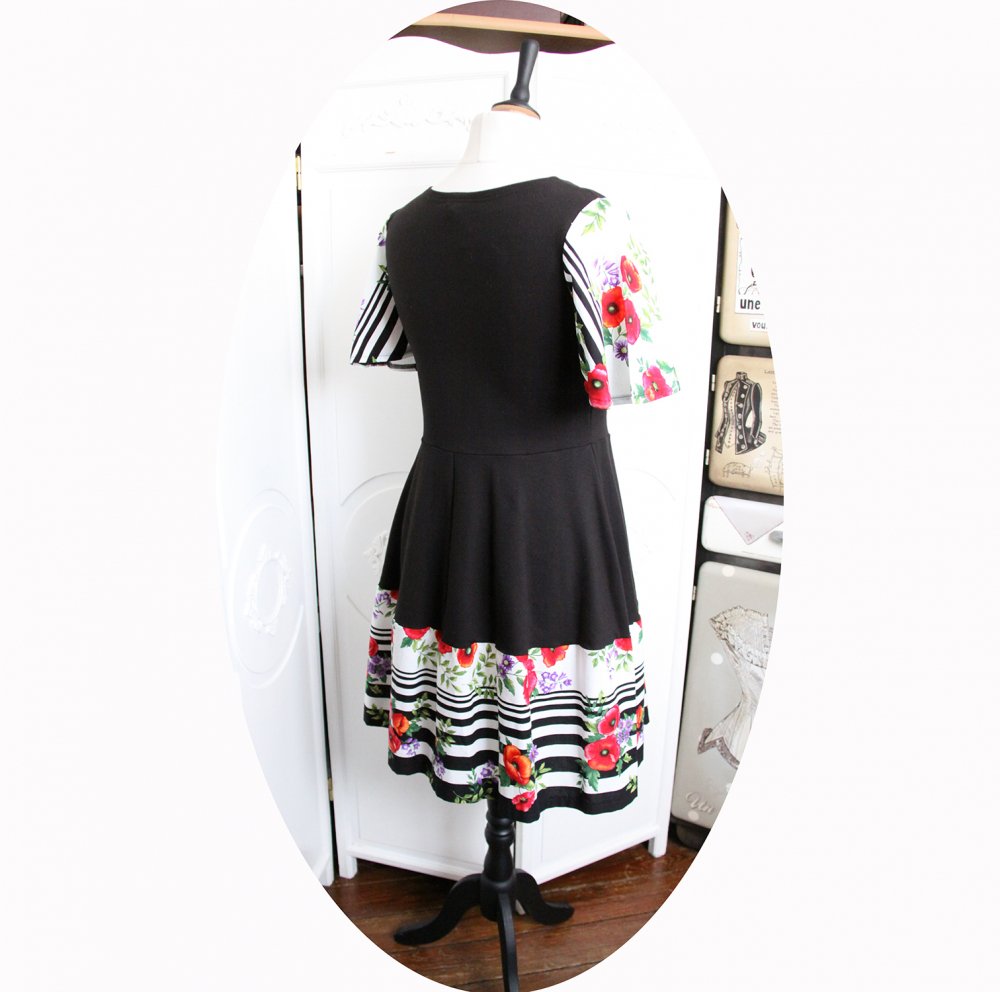 Coupée dans un jersey de coton noir (pour le confort), elle est ajustée dans le haut, un peu cintrée mais pas trop et bien évasée dans le bas pour faire une jolie jupe corolle. Les manches courtes papillon sont réalisées dans le même tissu à rayures et fleurs que le bas de la jupe.