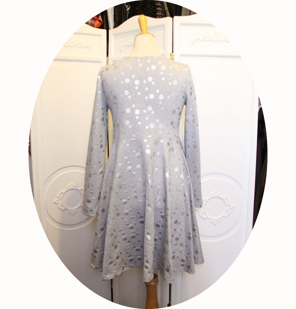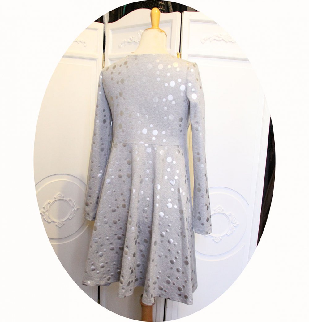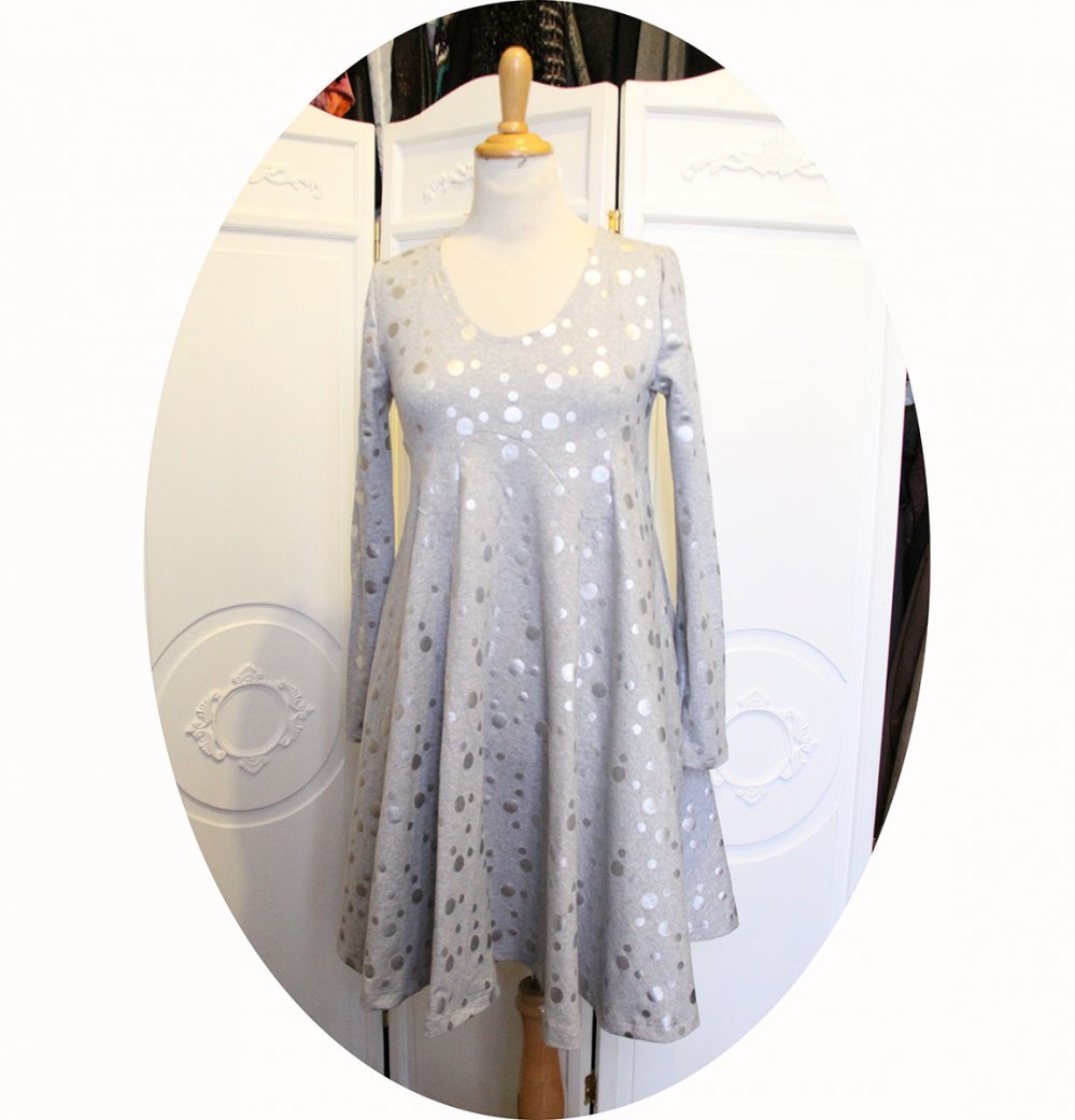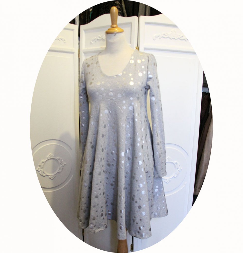 Robe 'Arabesque'  : une robe courte à manches longues en maille jersey de coton gris chiné imprimé de pois argent. Pour cette robe de demi saison j'ai choisi une belle maille jersey gris clair chiné, en coton et élasthanne pour le confort. Cette robe à manches longues est ajustée sur le buste et s'évase en une large jupe corolle. Le plus de cette robe souple et confortable : sa taille haute, dans le style empire, impératrice Joséphine ou 'regency' pour les fan de Jane Austen. Une découpe en arabesques entre le haut de la robe et la partie jupe sur l'avant permet d'avoir une grande ampleur de la partie jupe qui tombe en plis souples jusqu'au genou. Cette robe est idéale si vous aimez être à l'aise dans vos vêtements, si vous aimez vous sentir féminine et élégante sans avoir la taille trop marquée ou trop serrée. Facile à porter et à entretenir : elle passe en machine à 30°C. Disponible en stock en taille 38, présentée sur un buste en 38, les autres tailles sont disponibles sur commande.