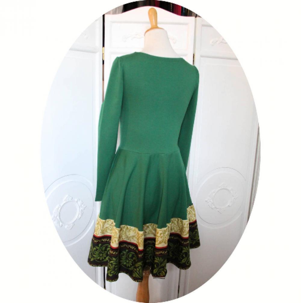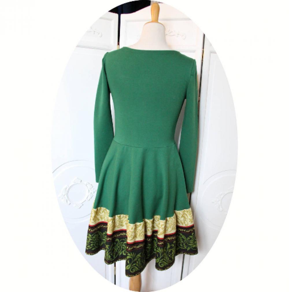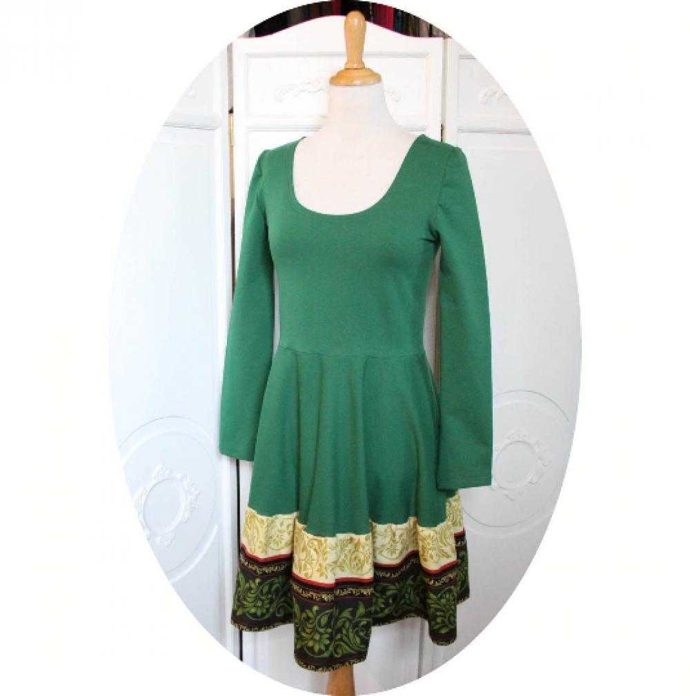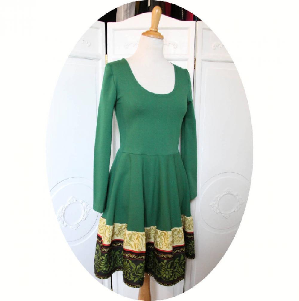 Un nouveau modèle de robe de robe évasée a manches longues en maille jersey coton vert et imprimé vert et ivoire en arabesques.