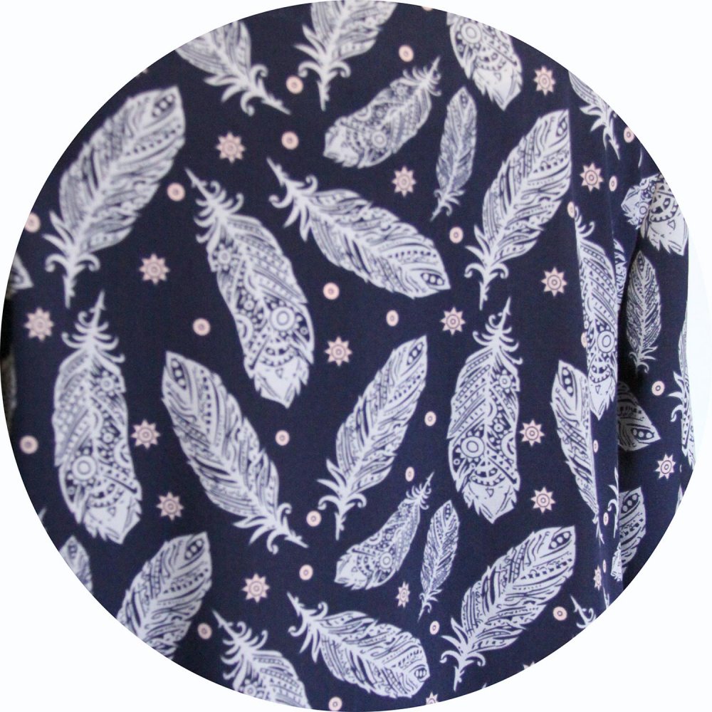 Voici la tunique fluide et souple en viscose et élasthanne bleue imprimée de plumes blanches.