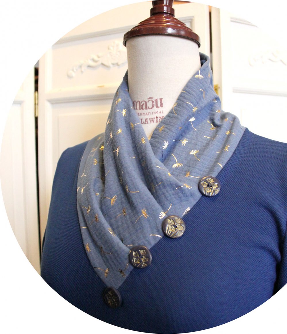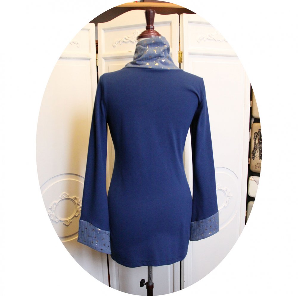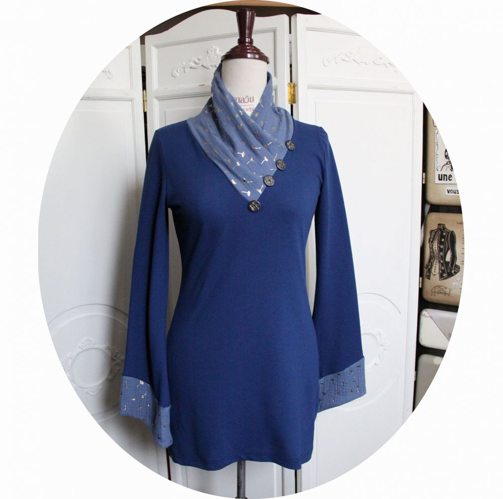 Tunique bleue et doré en maille de coton piquée. Une tunique bien longue et confortable, coupée dans une maille souple et douce, avec un grand col douillet. Pour cette tunique j'ai choisi d'associer deux tissus, une maille coton piquée (façon polo) d'un beau bleu et un coton double gaze imprimé d'un motif de pissenlits dorés. Cette tunique bleue et or à manches longues est munie d'un grand col croisé façon écharpe pour vous garder bien au chaud. Ce col est en double gaze bleu clair, on retrouve ce tissu bleu et or dans le bas des manches. Quatre boutons pissenlit réalisés par mes soins soulignent le bord du col. Cette tunique longue est plutôt ajustée sur le buste, un peu cintrée à la taille et évasée sur les hanches. J'ai créé cette tunique pour les femmes qui aiment le confort mais ne veulent pas sacrifier le style, bien couvrante pour éviter les courants d'air, bien souple pour être à l'aise, dans une maille coton qui passe en machine pour le coté pratique. Disponible en stock en taille S, M et L, autres tailles sur commande.