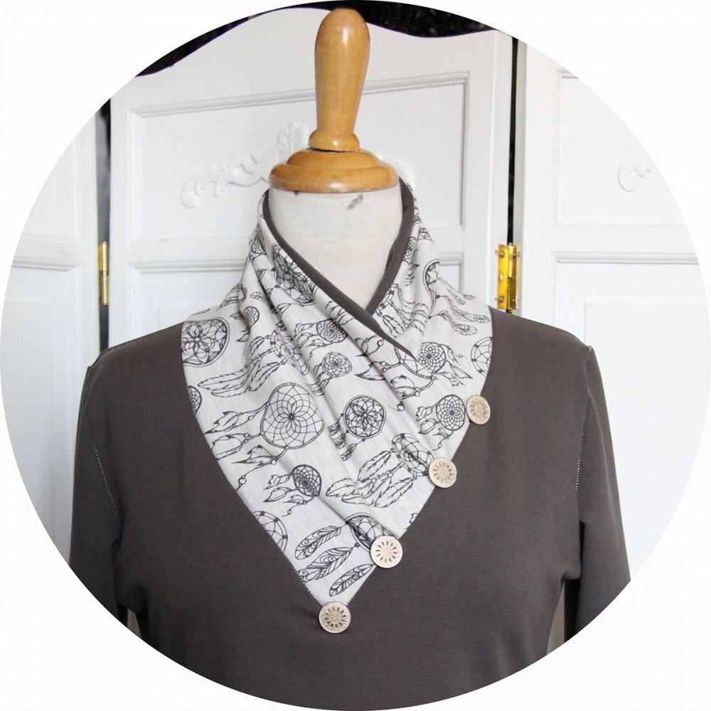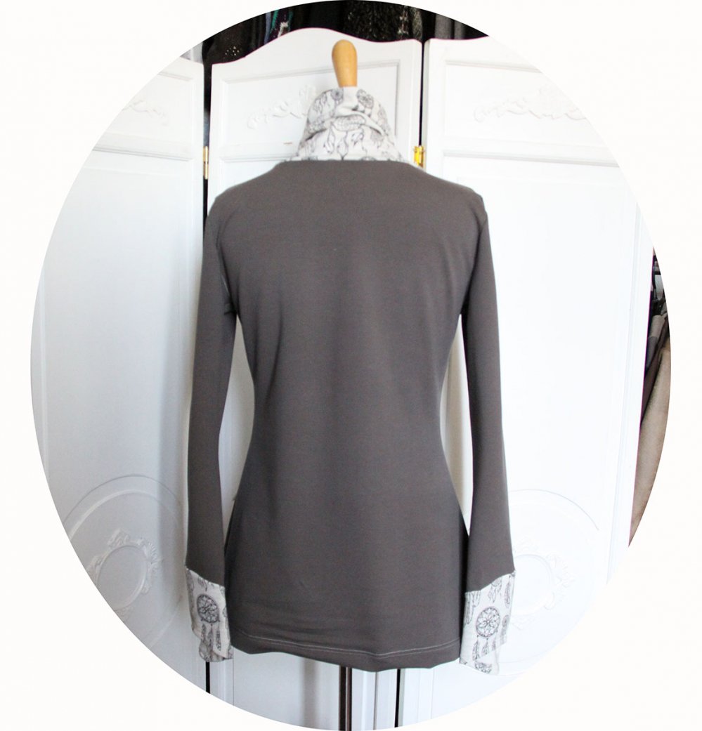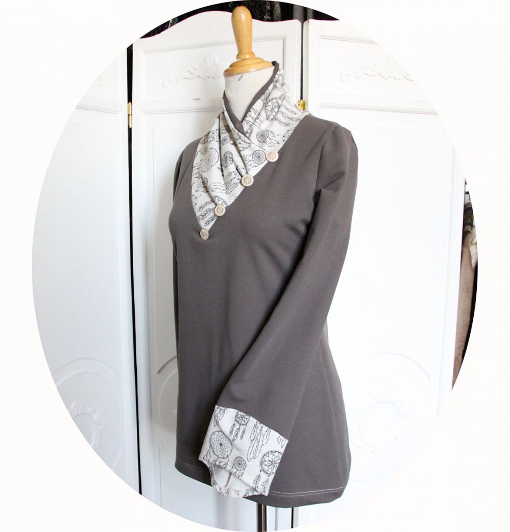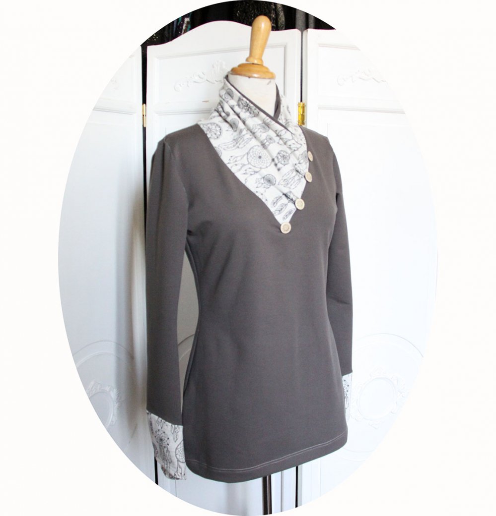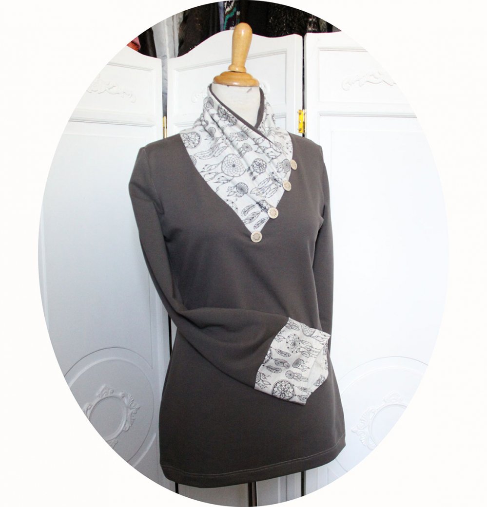 Tunique ivoire et taupe en jersey de coton stretch. Une tunique bien longue et confortable, coupée dans une maille souple et douce, avec un grand col douillet. Pour cette tunique j'ai choisi d'associer deux tissus, deux mailles de coton stretch : une maille uni taupe et une maille ivoire chinée imprimée de motifs attrapeurs de rêve et plumes. Cette tunique ivoire et taupe à manches longues est munie d'un grand col croisé façon écharpe pour vous garder bien au chaud. Ce col est en maille ivoire chinée doublée de taupe, on retrouve la maille ivoire imprimée dreamcatchers dans le bas des manches. Quatre boutons métalliques soulignent le bord du col. Cette tunique longue est plutôt ajustée sur le buste, un peu cintrée à la taille et évasée sur les hanches. J'ai créé cette tunique pour les femmes qui aiment le confort mais ne veulent pas sacrifier le style, bien couvrante pour éviter les courants d'air, bien souple pour être à l'aise, dans une maille coton qui passe en machine pour le coté pratique. Disponible en stock en tailles S, M et L, je peux en refaire une de plus dans la taille de votre choix