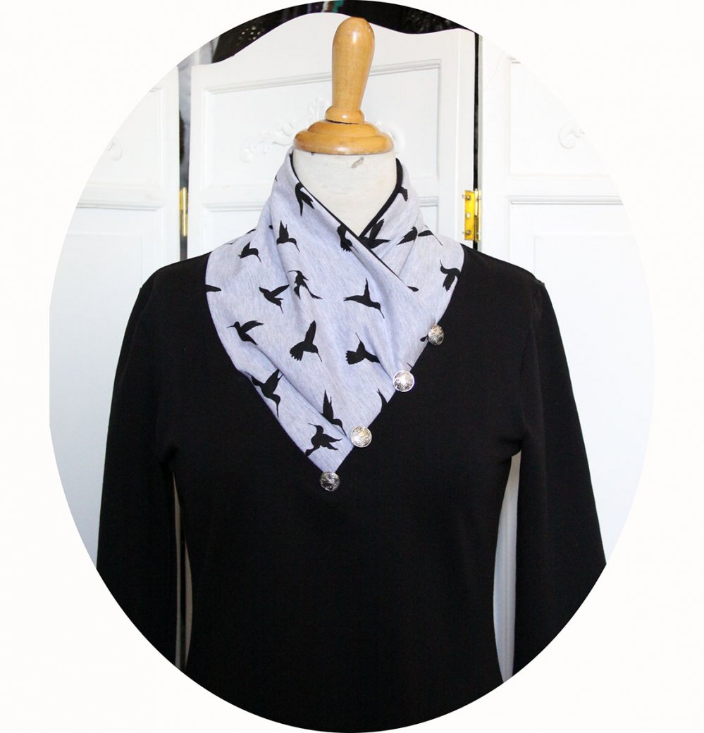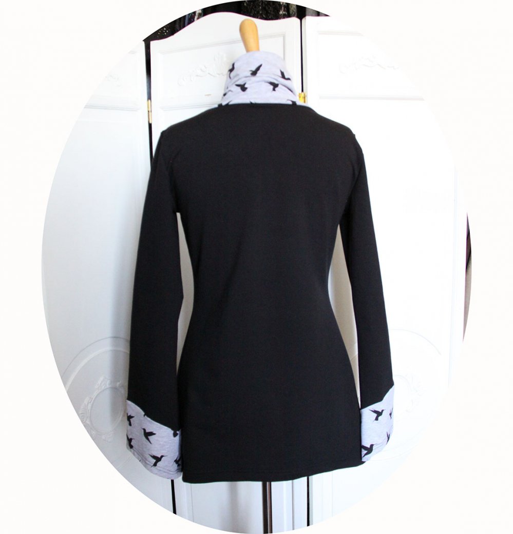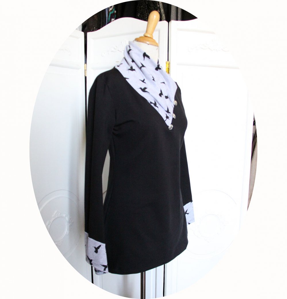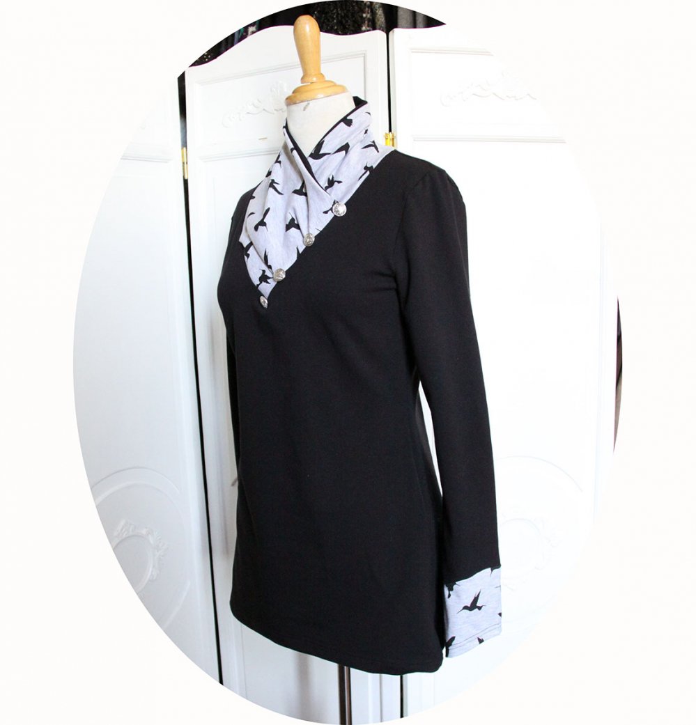 Cette tunique grise et noir à manches longues est munie d'un grand col croisé façon écharpe pour vous garder bien au chaud. Ce col est en maille grise doublée de noir, on retrouve la maille grise imprimée d'oiseaux dans le bas des manches. Quatre boutons métalliques soulignent le bord du col.