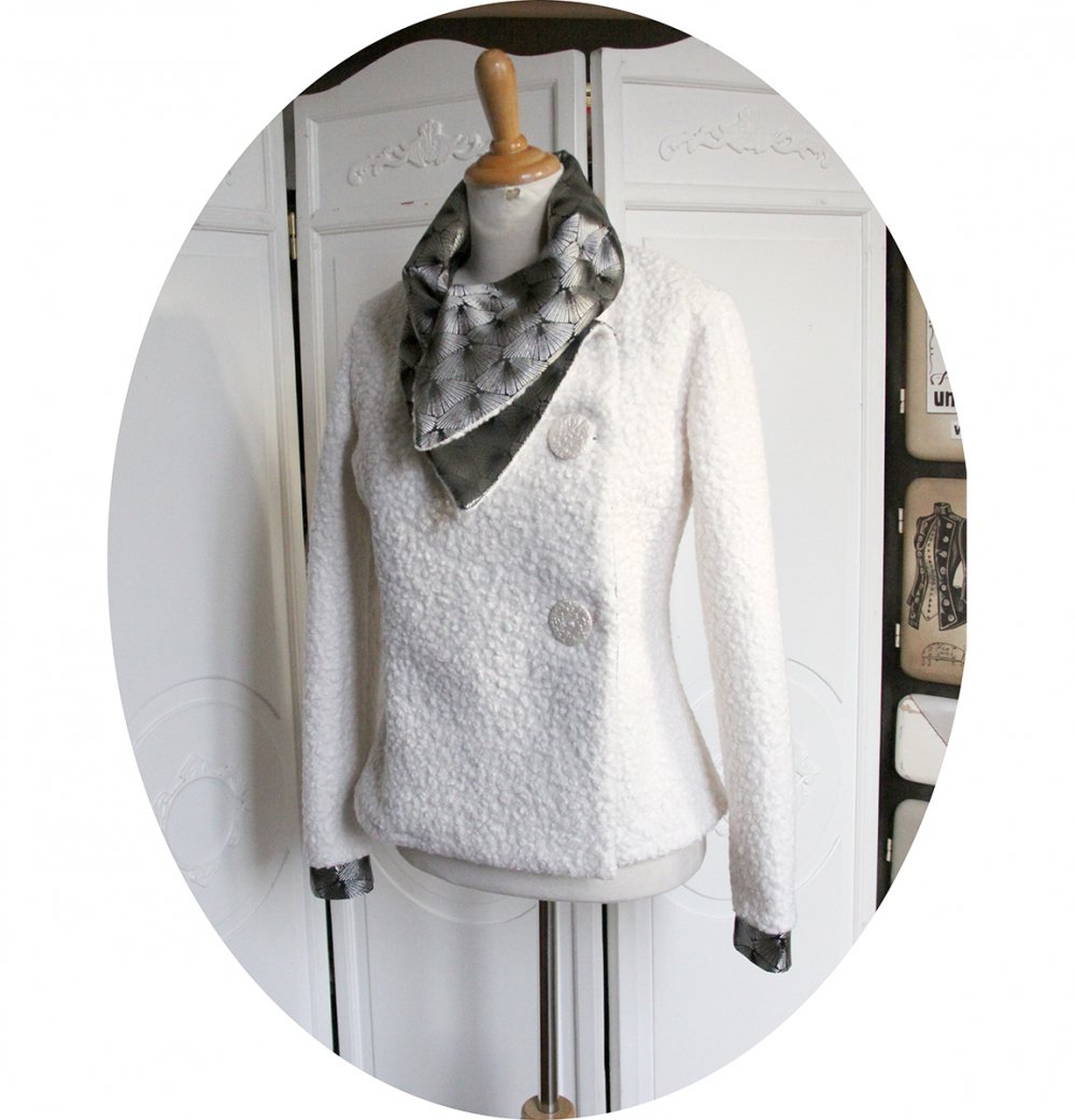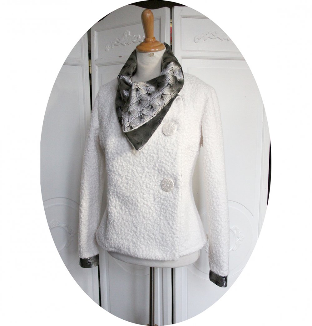 Veste blanc en maille bouclette synthétique et tissu Jacquard noir et blanc, grand col montant et fermeture croisée.