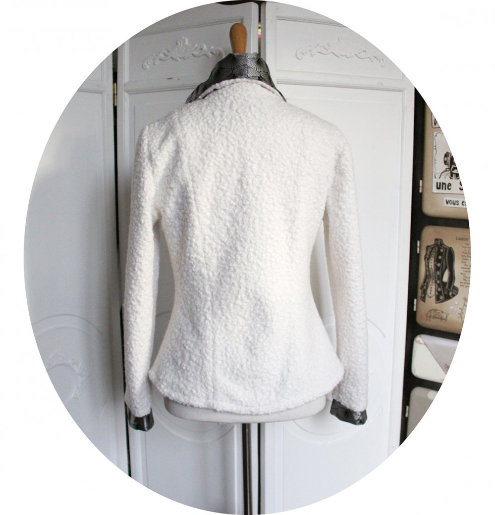 Une veste simple et chic en maille synthétique à bouclettes, fermée sur le coté. Cette veste d'hiver pour l'intérieur ou de demi saison pour l'extérieur est cintrée à la taille sur les cotés et dans le dos.