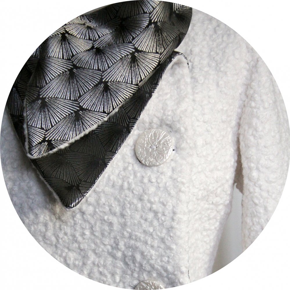 Cette veste blanche et noire cintrée se ferme par de larges boutons sur le coté, qui vous permet de garder le col ouvert en large pans ou bien remonté sur le cou en col boule. Les boutons ont été réalisés par mes soins, j'ai repris les coloris de la veste en blanc ivoire à motifs Art Nouveau.