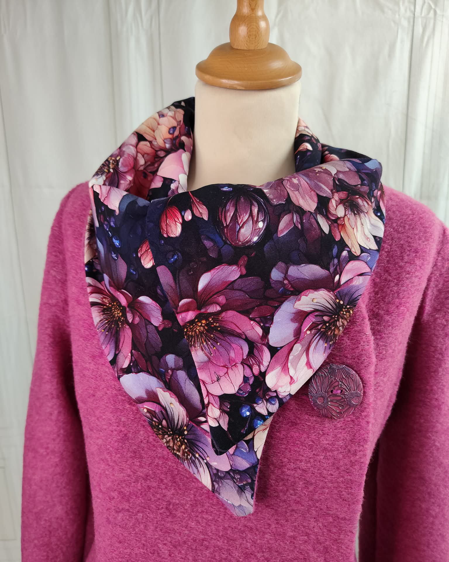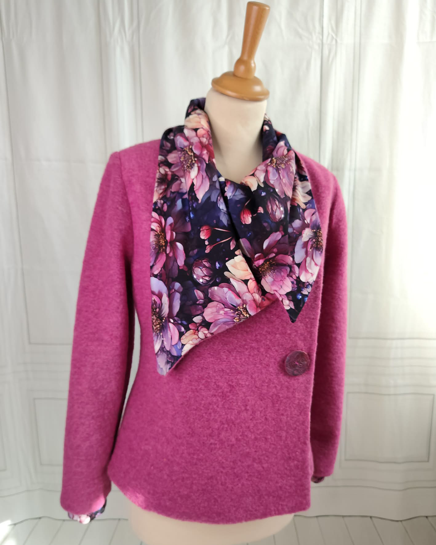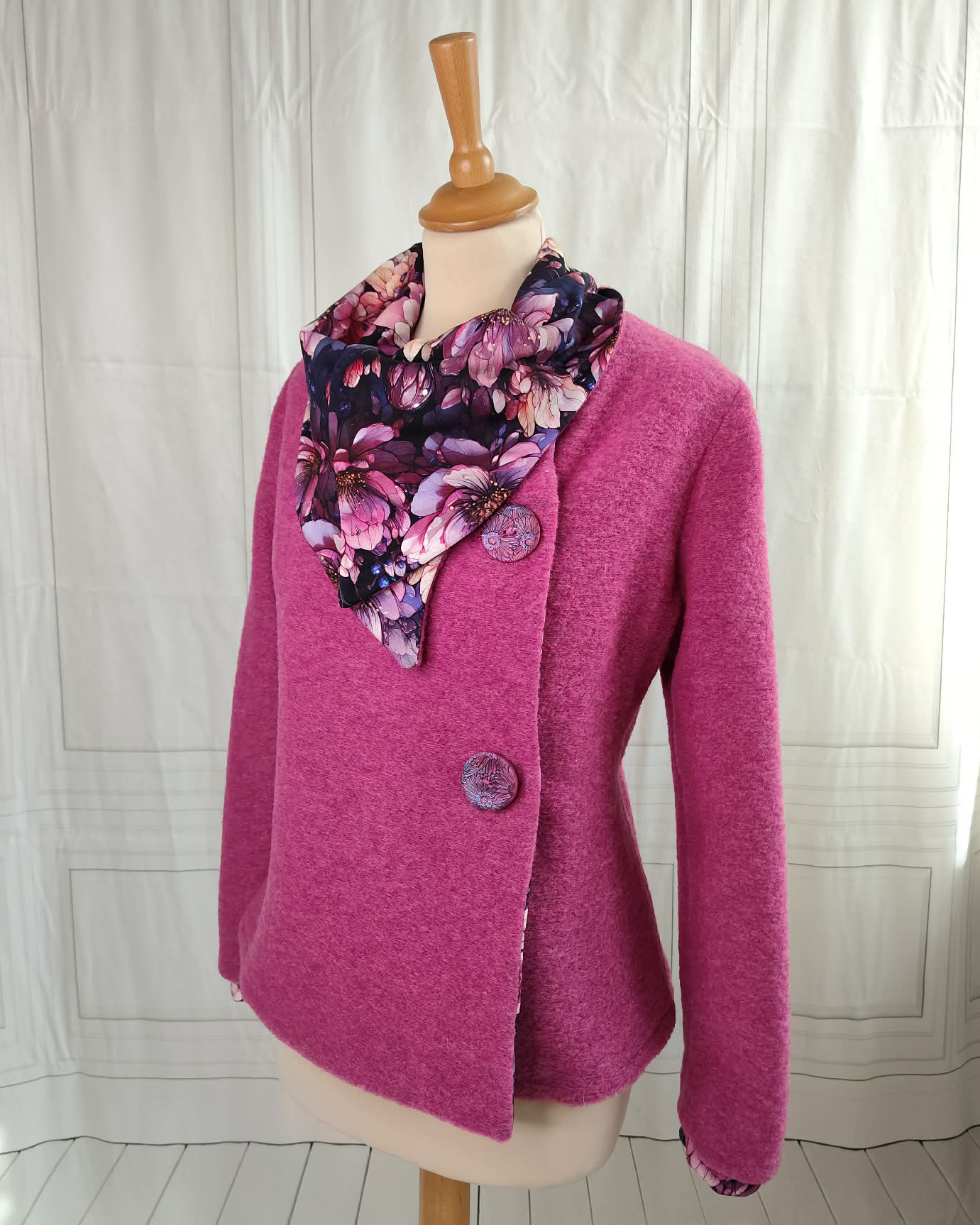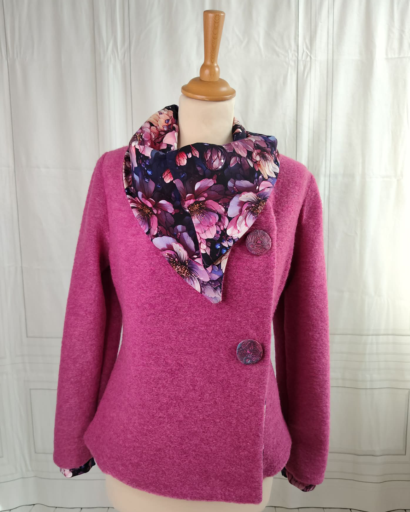 Cette veste rose et mauve cintrée se ferme par de larges boutons sur le coté, qui vous permet de garder le col ouvert en large pans ou bien remonté sur le cou en col boule. Les boutons sont réalisés par mes soins en polymère violette avec un motif floral rehaussé de poudre de mica.