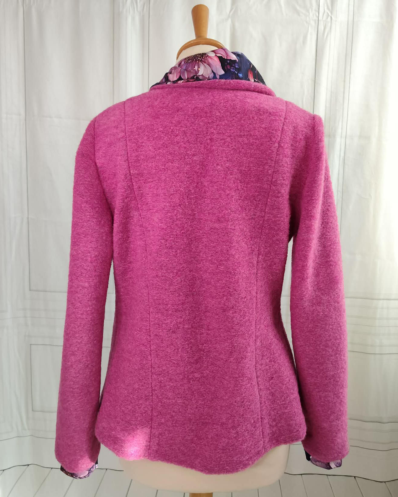 Une veste simple et chic en laine rose fuchsia, fermée sur le coté. Cette veste d'hiver pour l'intérieur ou de demi saison pour l'extérieur est cintrée à la taille sur les cotés et dans le dos.