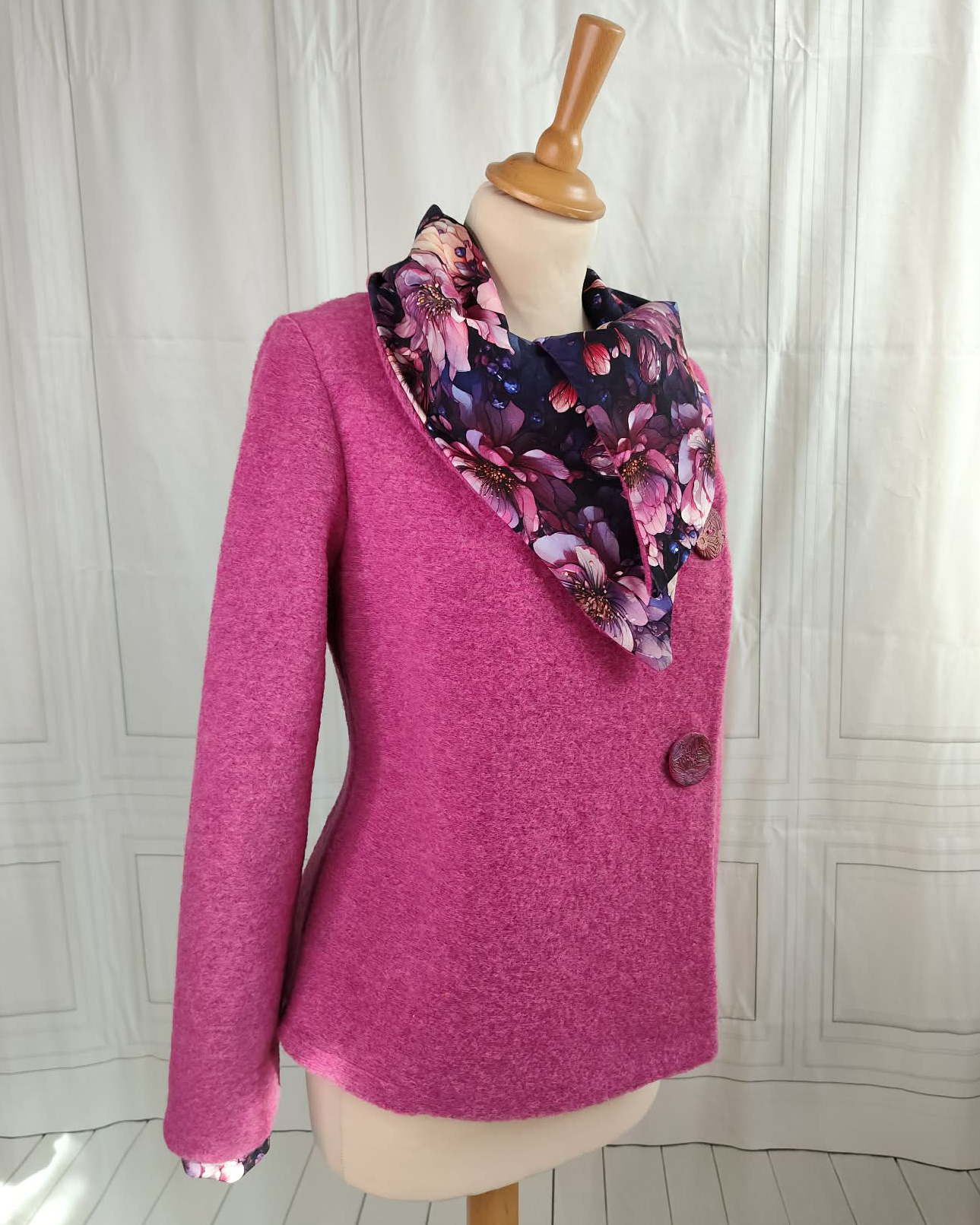 Veste rose vif en laine et coton imprimé assorti, grand col montant et fermeture croisée.