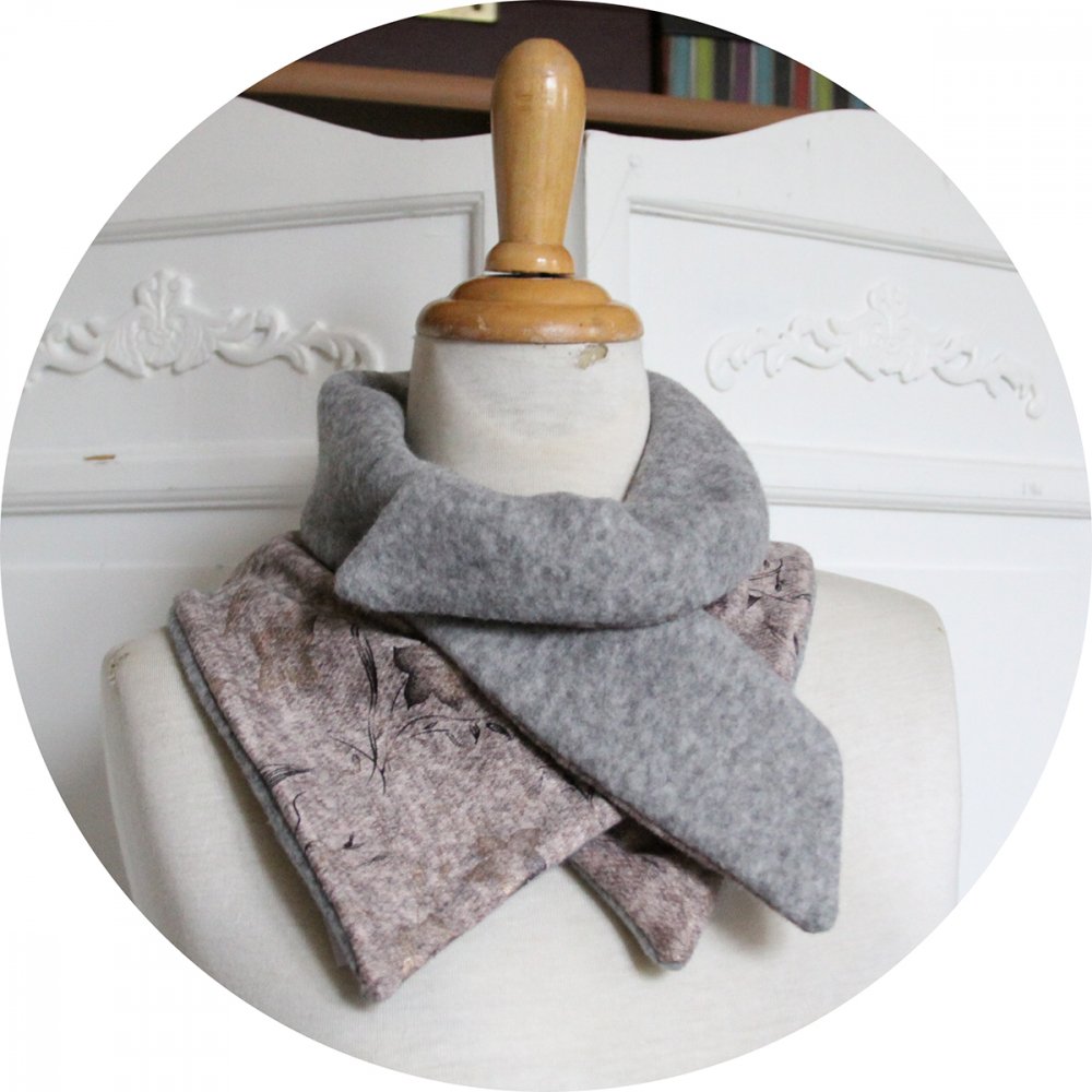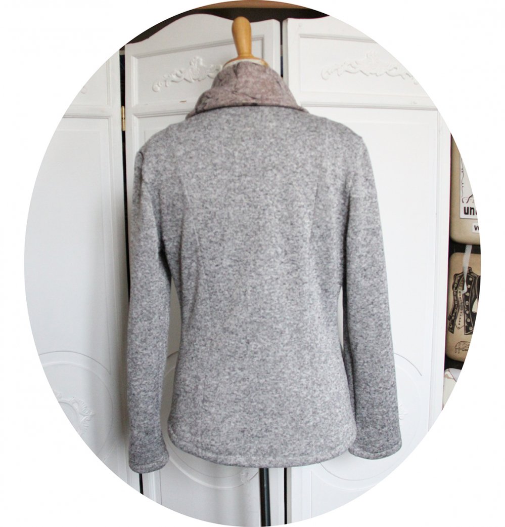 Veste gris clair chiné en maille polaire et molleton rose clair, grand col montant et fermeture croisée.