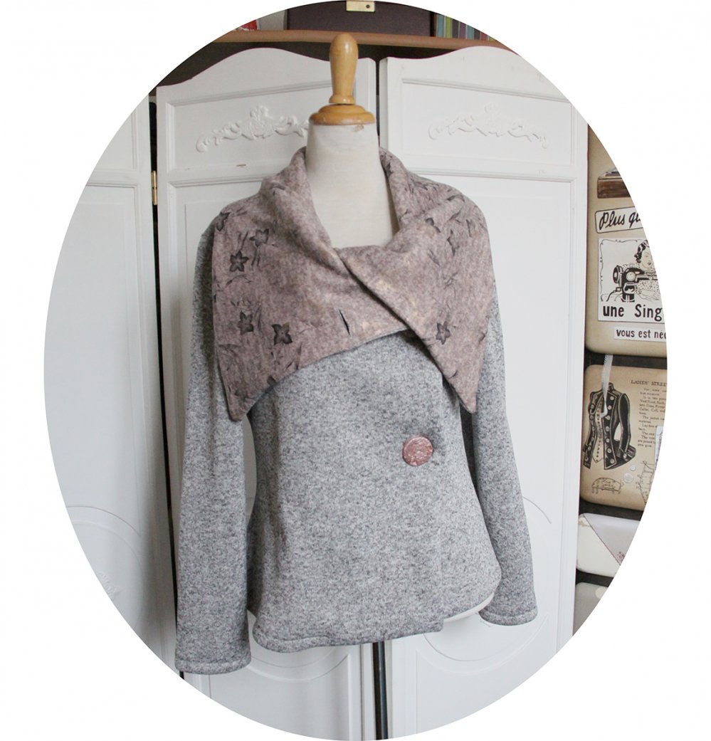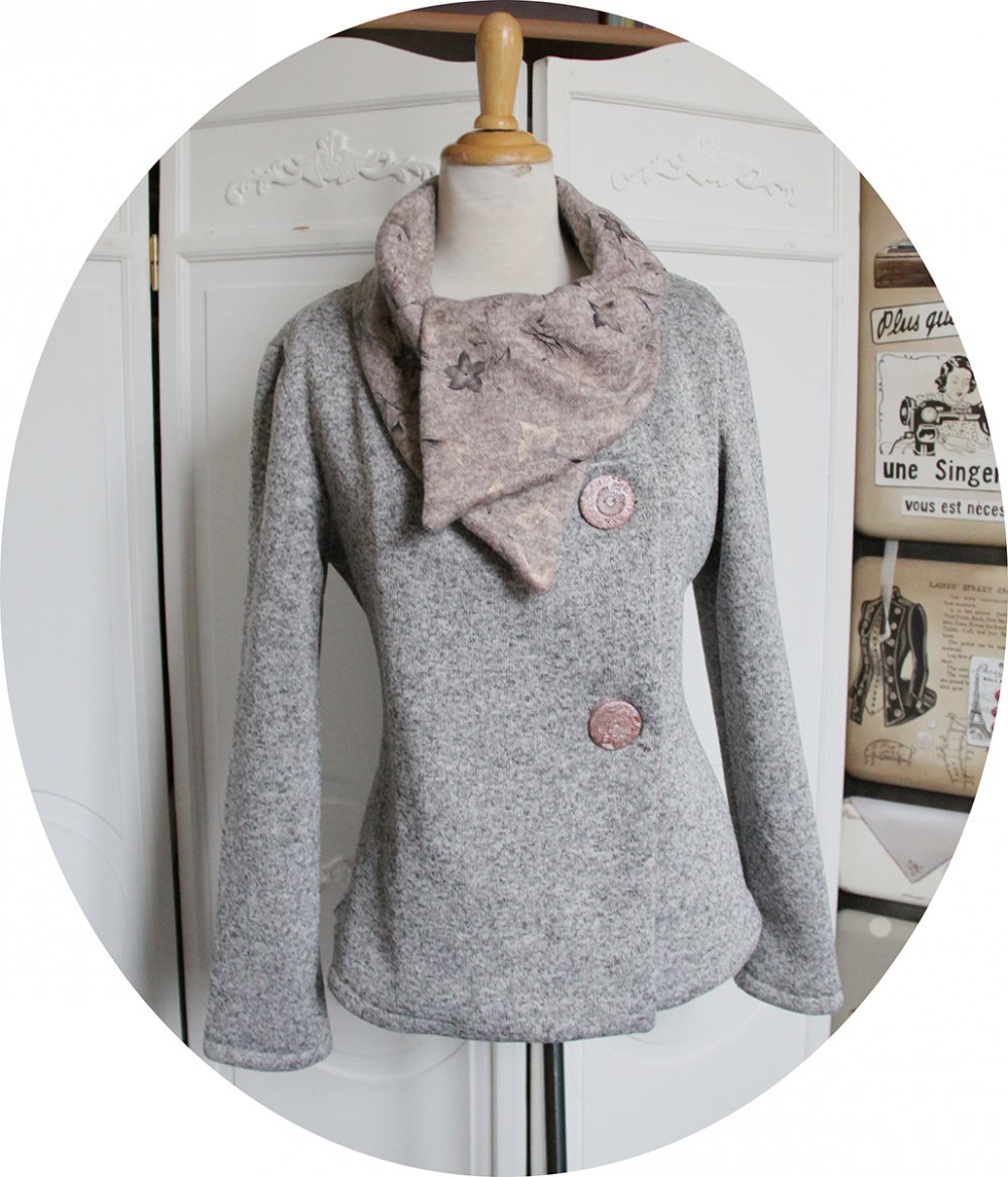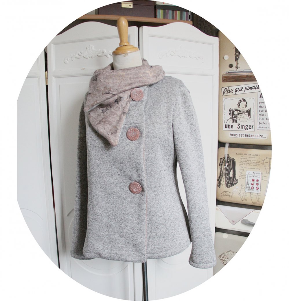Elle se ferme par de larges boutons réalisés par mes soins sur le coté, qui vous permet de garder le col ouvert en large pans ou bien remonté sur le cou en col boule.