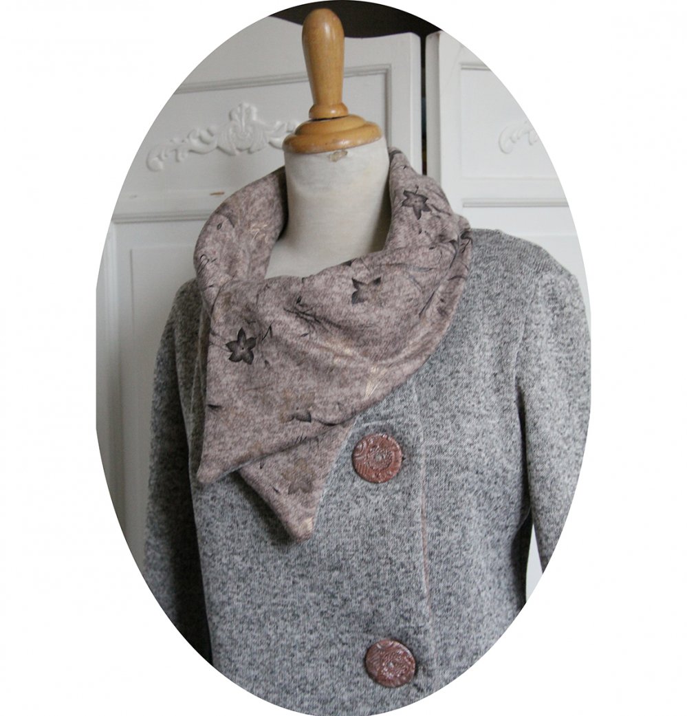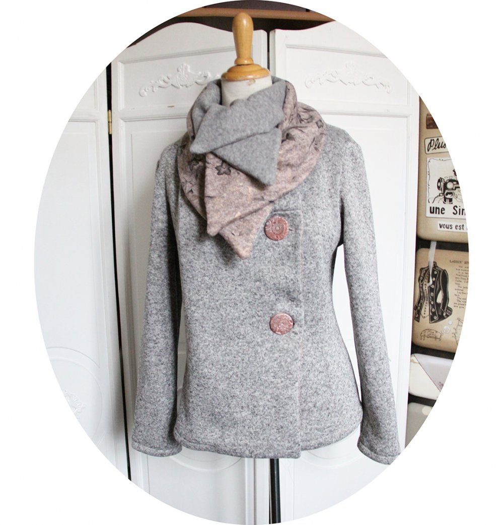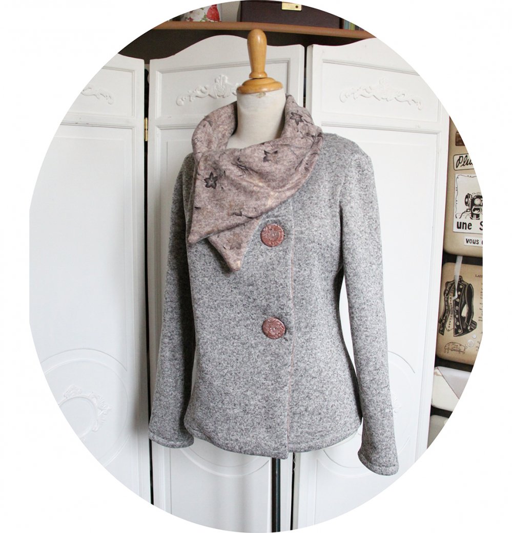 Elle se ferme par de larges boutons réalisés par mes soins sur le coté, qui vous permet de garder le col ouvert en large pans ou bien remonté sur le cou en col boule.