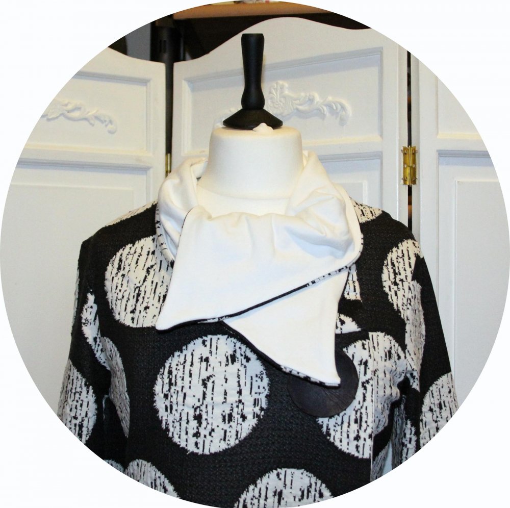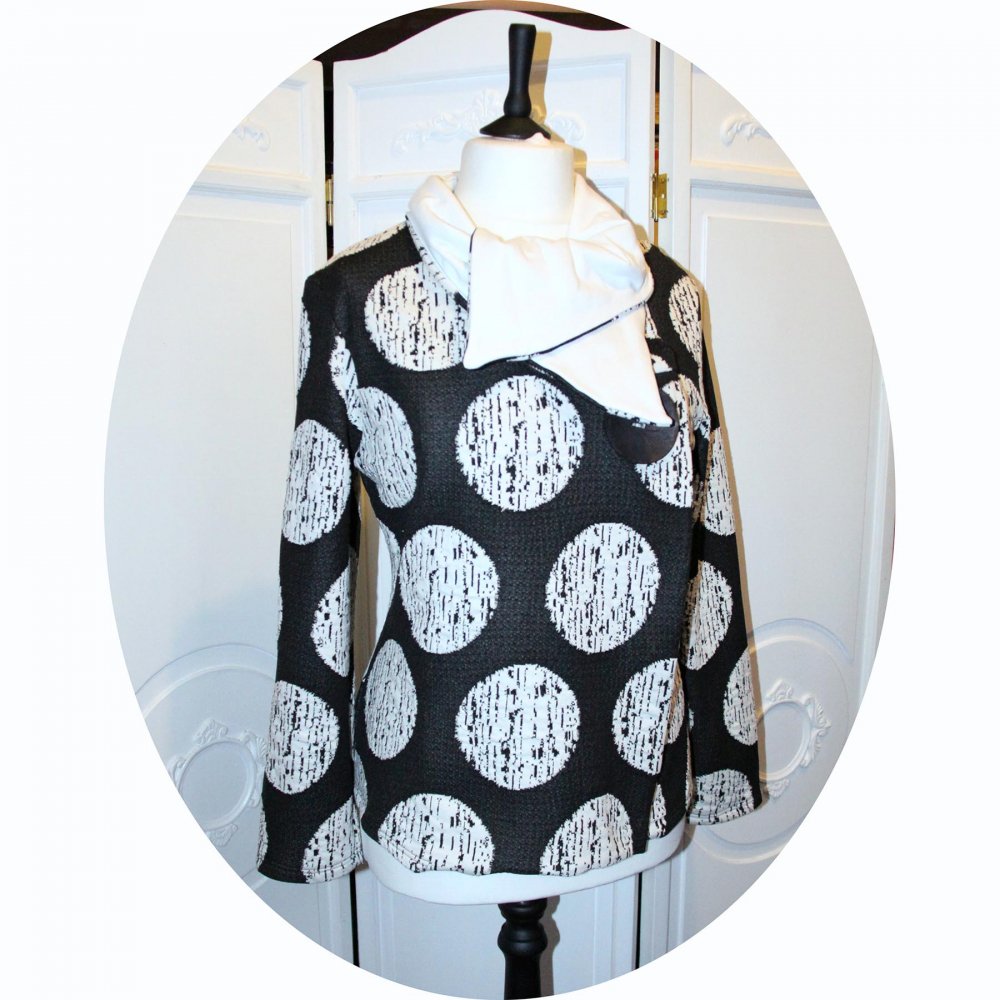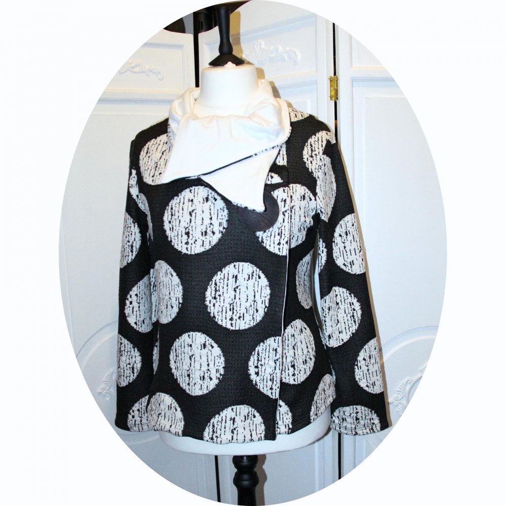 Veste gris e à grand pois ivoire et maille ivoire unie en maille souple, grand col montant et fermeture croisée.