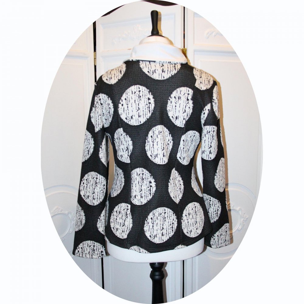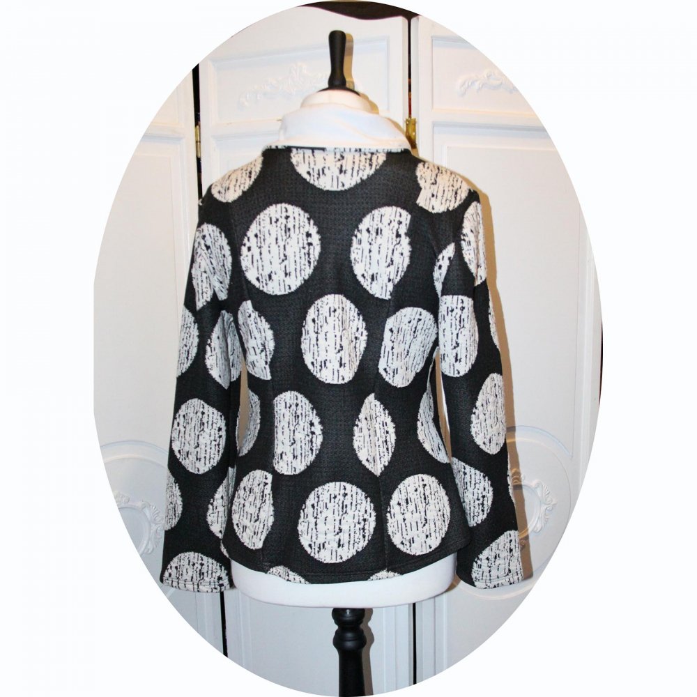 Une veste simple et chic en maille gris anthracite à larges pois blancs, fermée sur le coté.