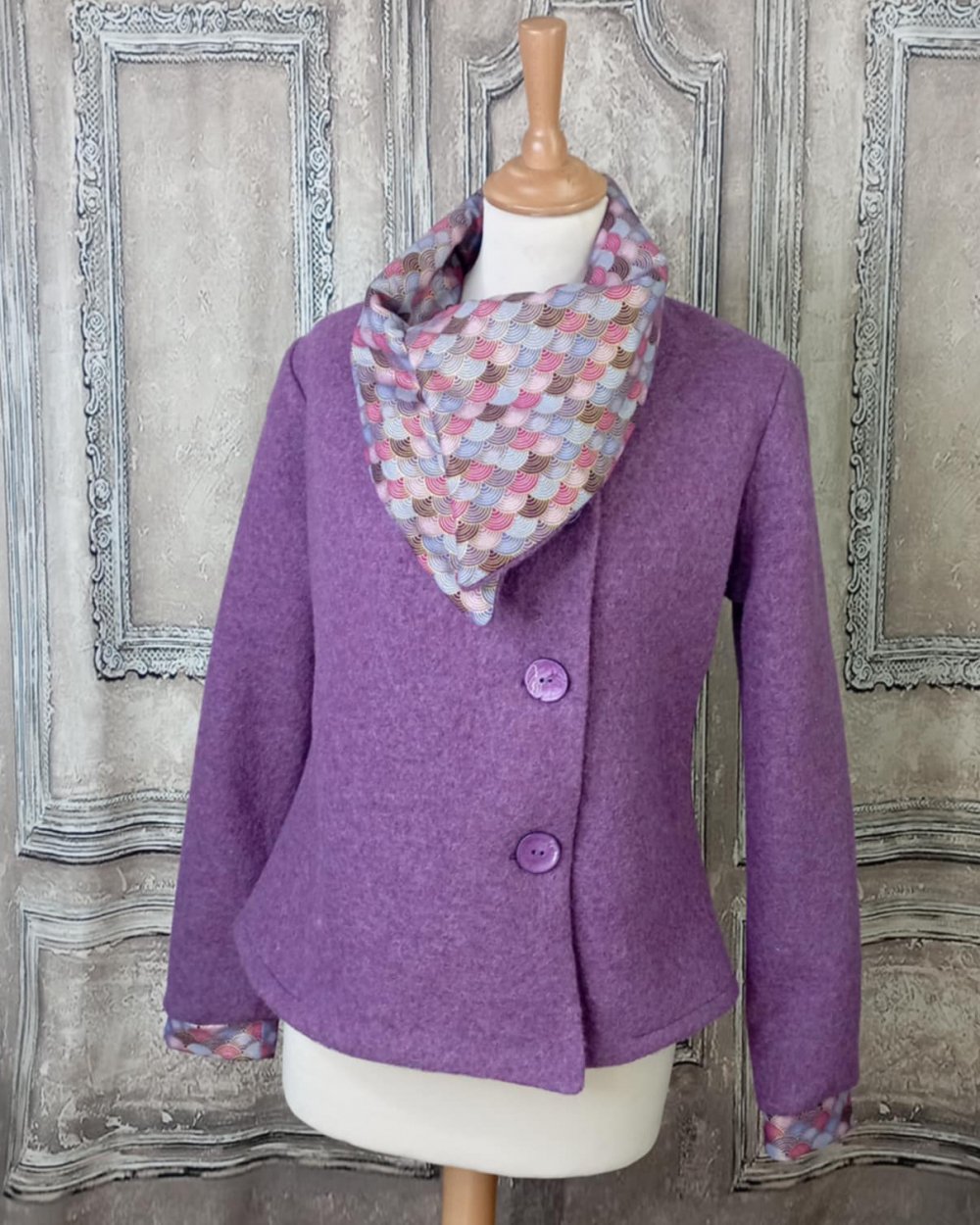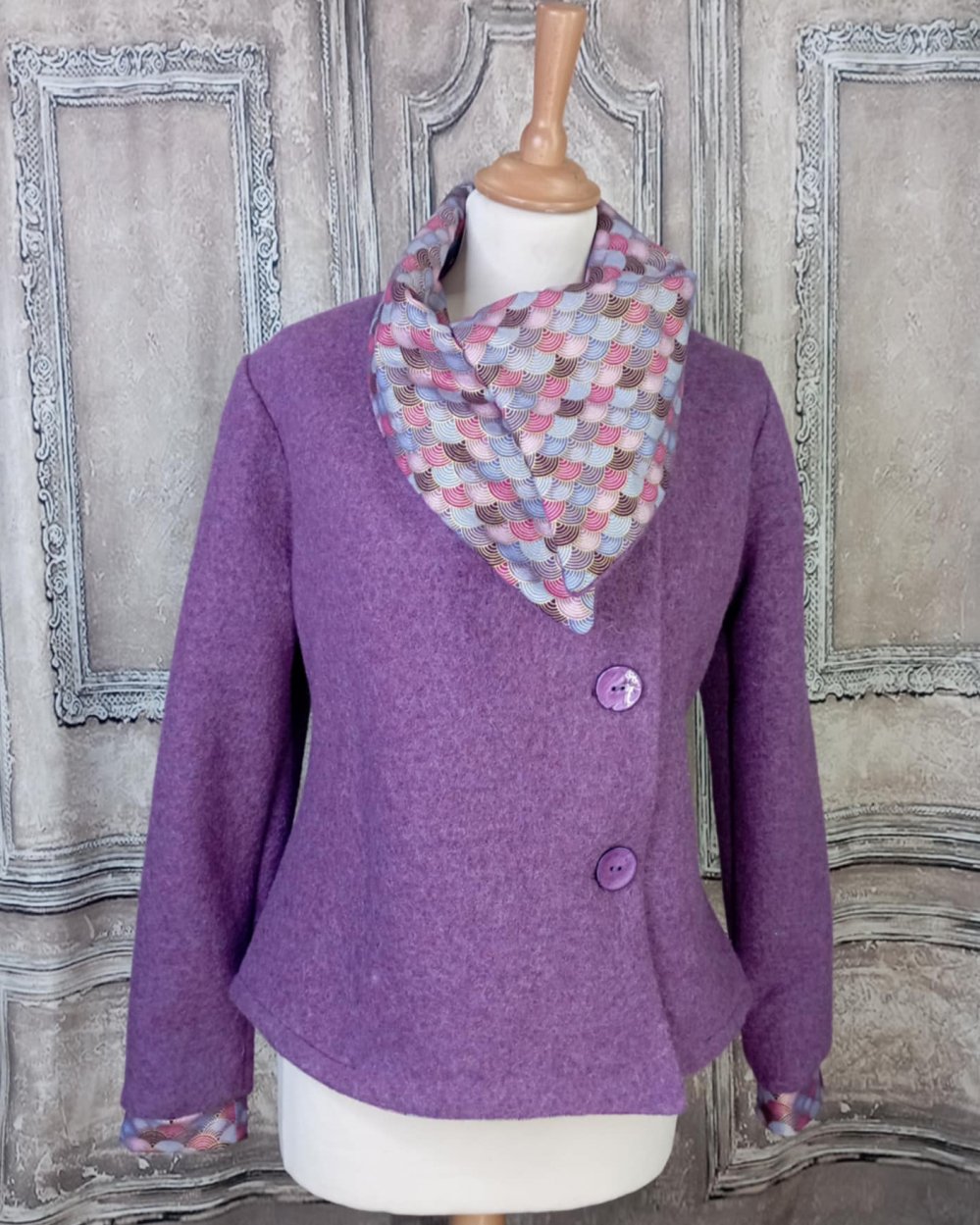 Veste violet doux en laine bouillie et coton imprimé assorti, grand col montant et fermeture croisée.