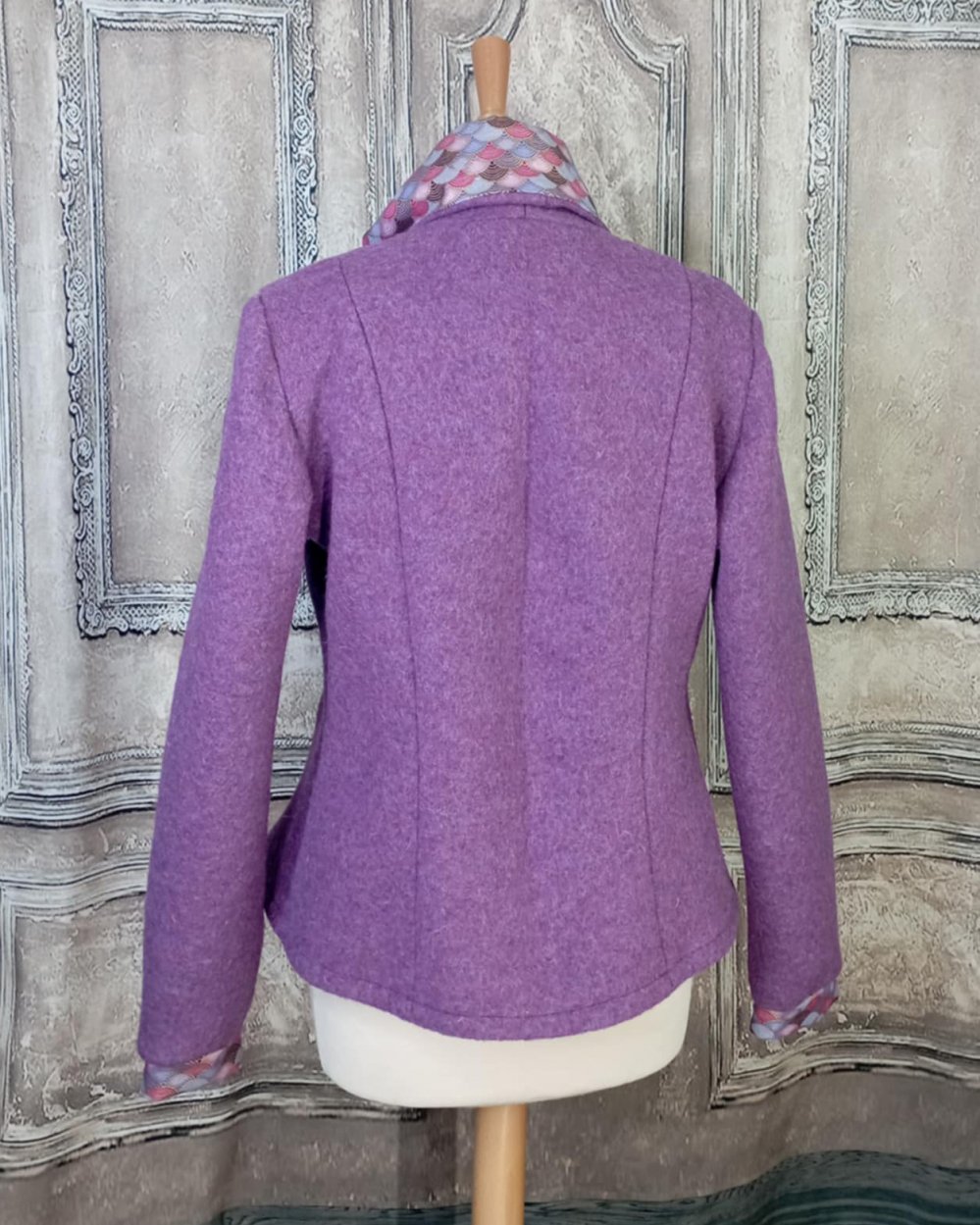 Une veste simple et chic en laine bouillie mauve, fermée sur le coté. Cette veste d'hiver pour l'intérieur ou de demi saison pour l'extérieur est cintrée à la taille sur les cotés et dans le dos.