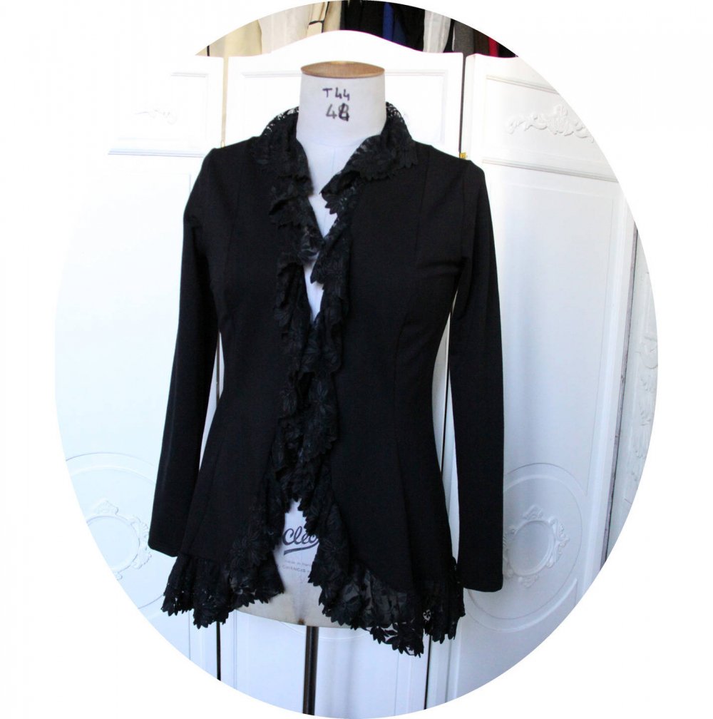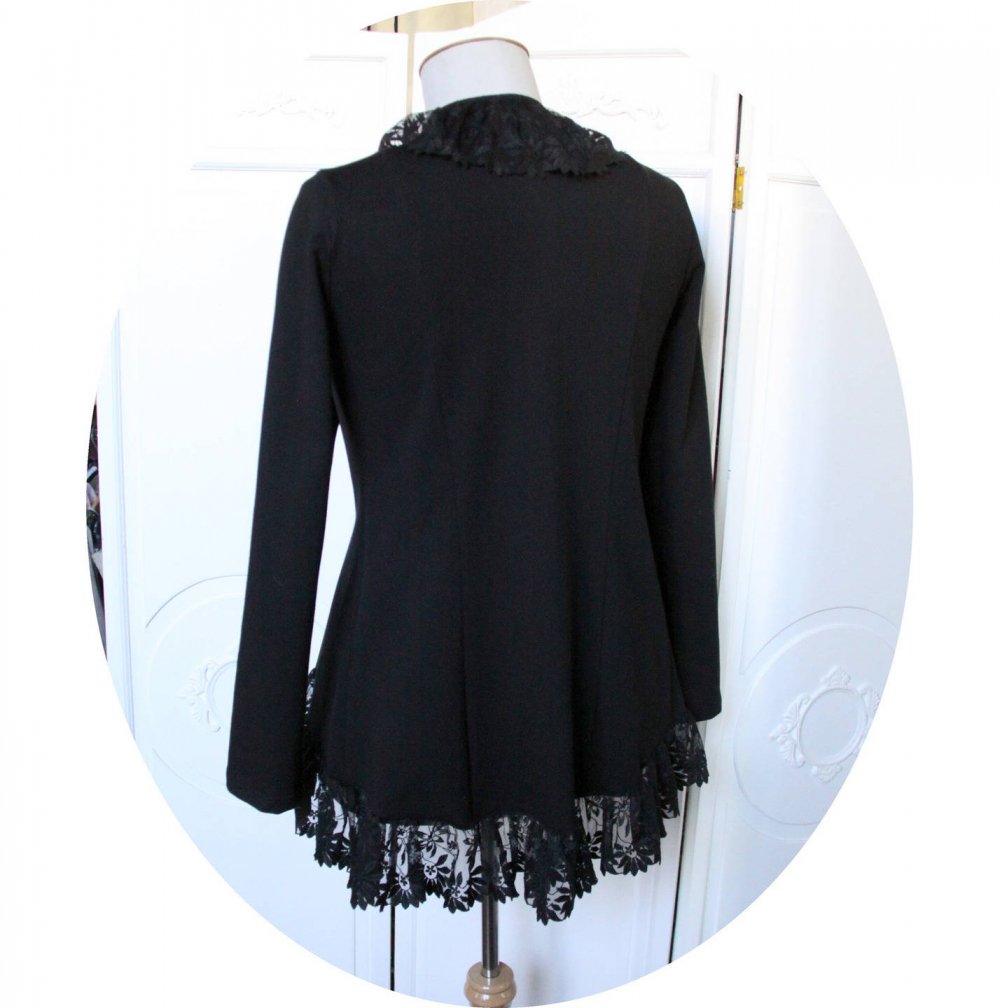 Un gilet bien long, féminin et romantique en maille de coton broderie sur tulle noir.