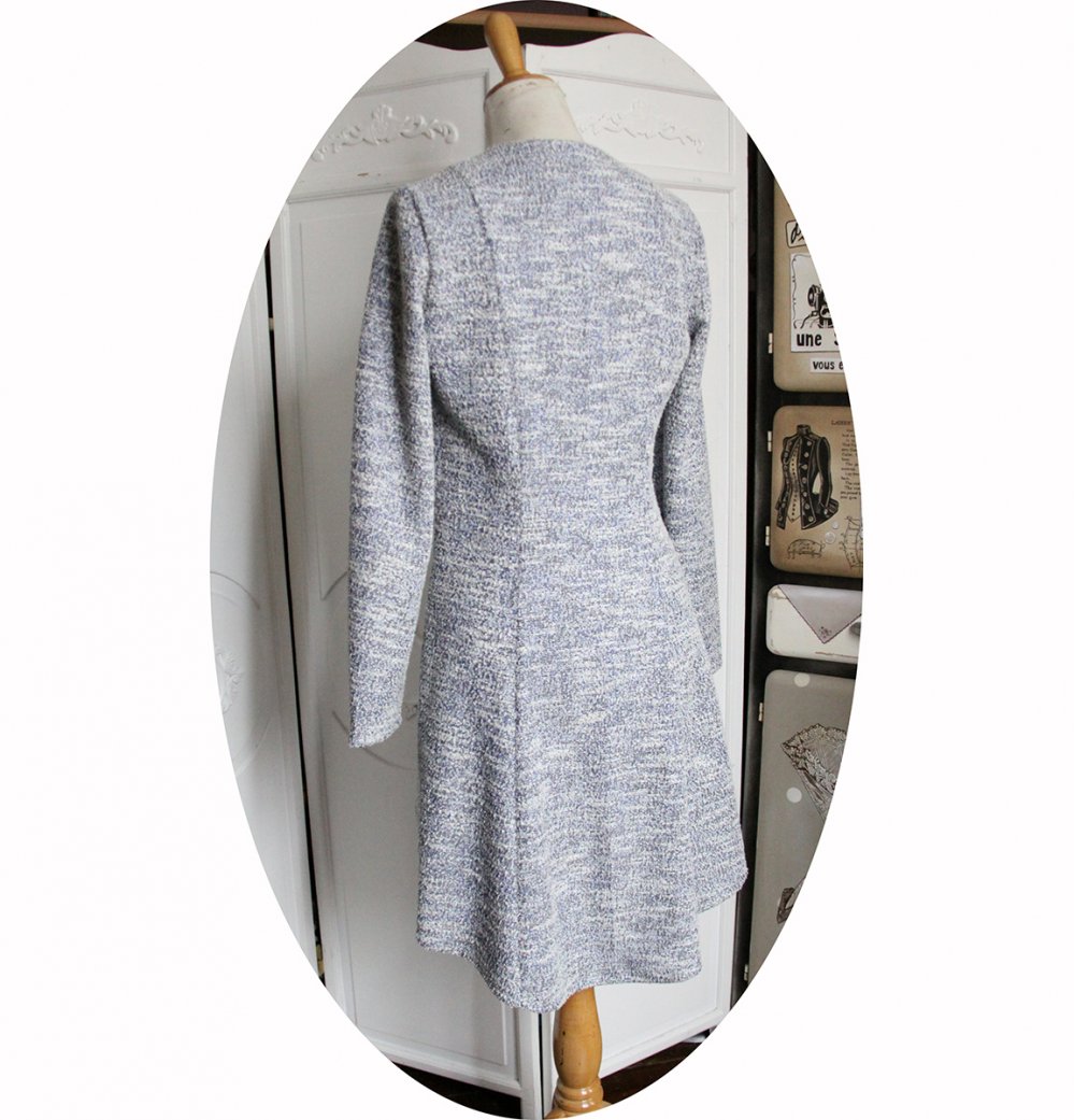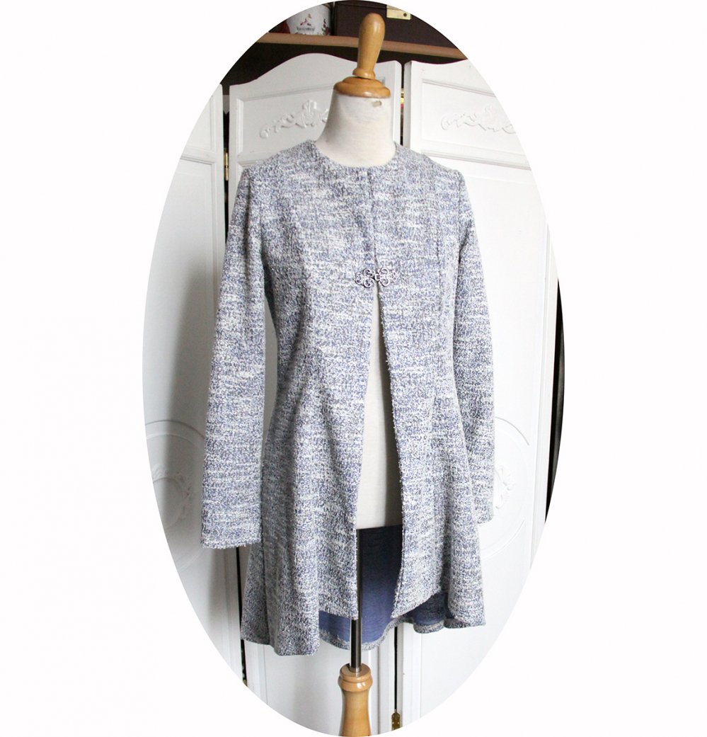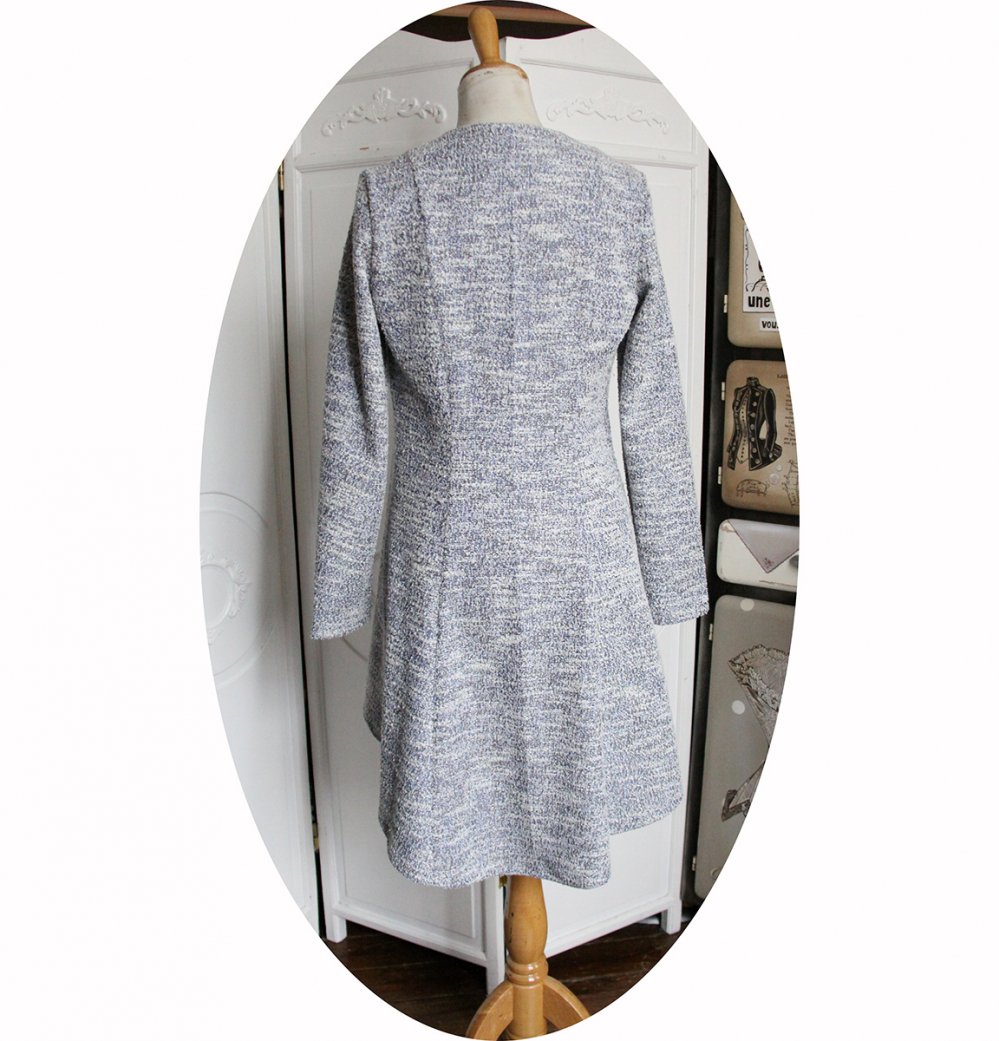 Coupée dans une maille synthétique souple, la veste n'est pas doublée pour vous permettre de profiter du confort et de la souplesse de la maille. Pour le tissu, j'ai craqué sur cette maille lumineuse en bleu chiné d'ivoire et d'argent.